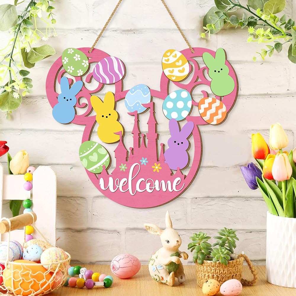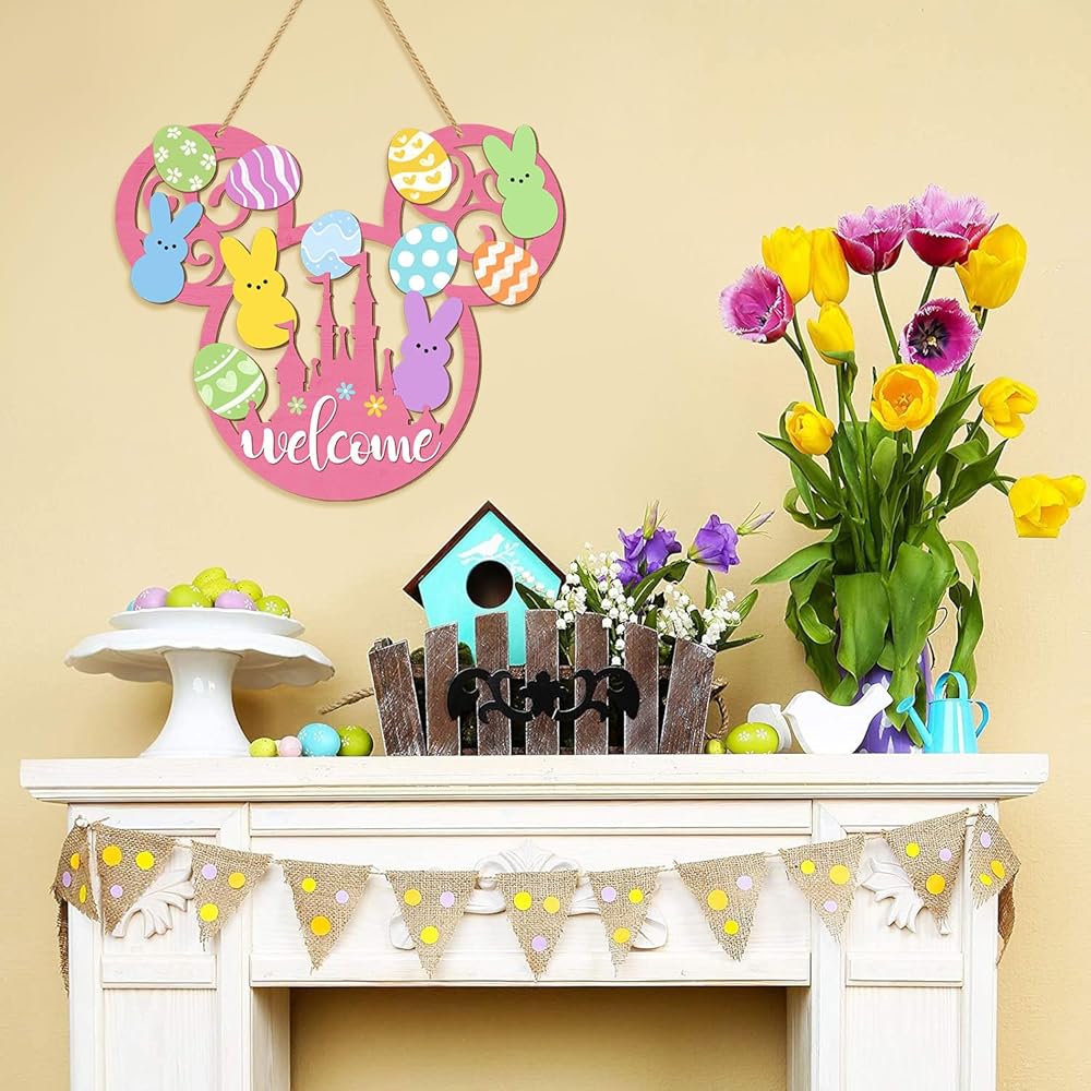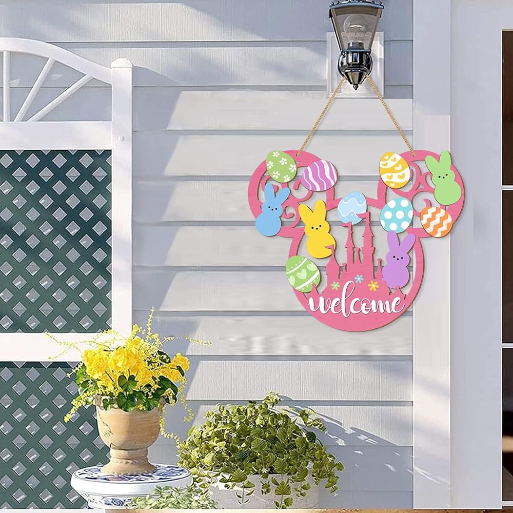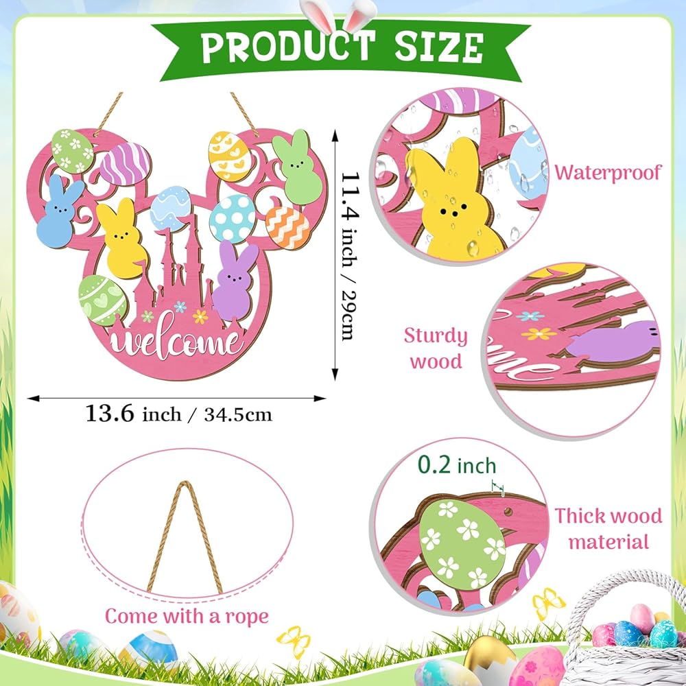 This charming Easter bunny door sign brings delightful springtime cheer to your home with its whimsical mouse-shaped design. Crafted from quality wood, this welcome plaque features an adorable collection of colorful Easter eggs in pastel shades of pink, blue, yellow, green, and orange, each decorated with playful patterns including polka dots, stripes, chevrons, hearts, and flowers. Cute bunny silhouettes in soft pastel colors add an extra touch of Easter magic to the design. The pink base features a cheerful "welcome" message along with a decorative castle motif adorned with colorful flowers. Measuring 13.6 inches in length and 11.4 inches in width, this eye-catching decoration makes a bold statement on your front door, porch, or yard. The convenient hanging mount style includes a sturdy rope for easy display. This farmhouse-style Easter decoration is lightweight, making it simple to hang and reposition as desired. Perfect for celebrating the spring season and welcoming guests with festive Easter spirit, this wooden hanging decoration adds a touch of whimsy and warmth to your home decor throughout the Easter holiday.