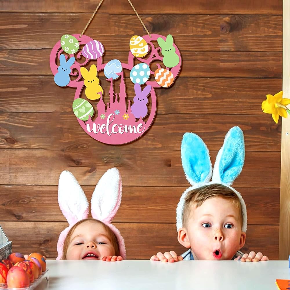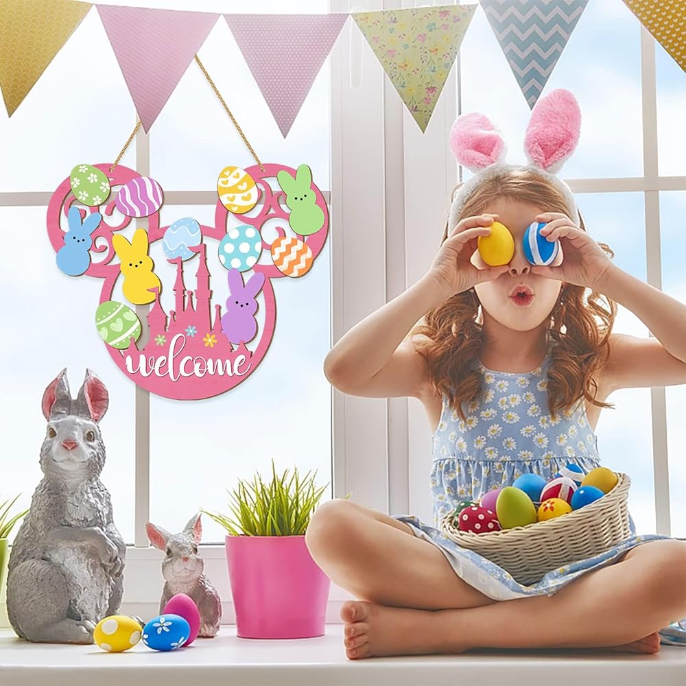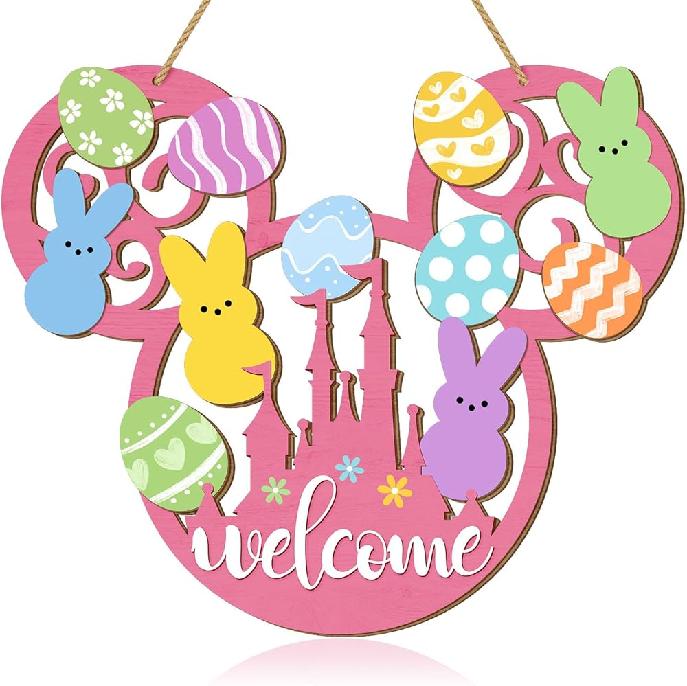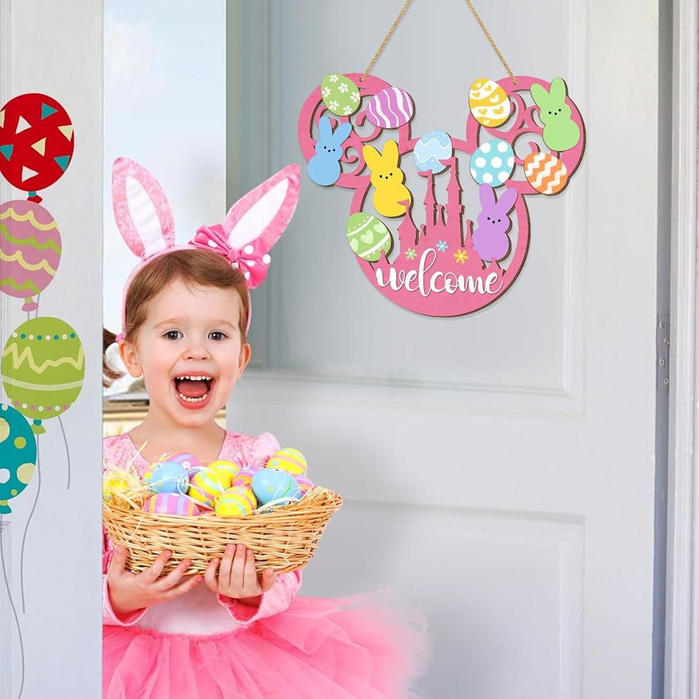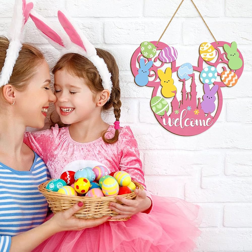 This charming Easter bunny door sign brings delightful springtime cheer to your home with its whimsical mouse-shaped design. Crafted from quality wood, this welcome plaque features an adorable collection of colorful Easter eggs in pastel shades of pink, blue, yellow, green, and orange, each decorated with playful patterns including polka dots, stripes, chevrons, hearts, and flowers. Cute bunny silhouettes in soft pastel colors add an extra touch of Easter magic to the design. The pink base features a cheerful "welcome" message along with a decorative castle motif adorned with colorful flowers. Measuring 13.6 inches in length and 11.4 inches in width, this eye-catching decoration makes a bold statement on your front door, porch, or yard. The convenient hanging mount style includes a sturdy rope for easy display. This farmhouse-style Easter decoration is lightweight, making it simple to hang and reposition as desired. Perfect for celebrating the spring season and welcoming guests with festive Easter spirit, this wooden hanging decoration adds a touch of whimsy and warmth to your home decor throughout the Easter holiday.