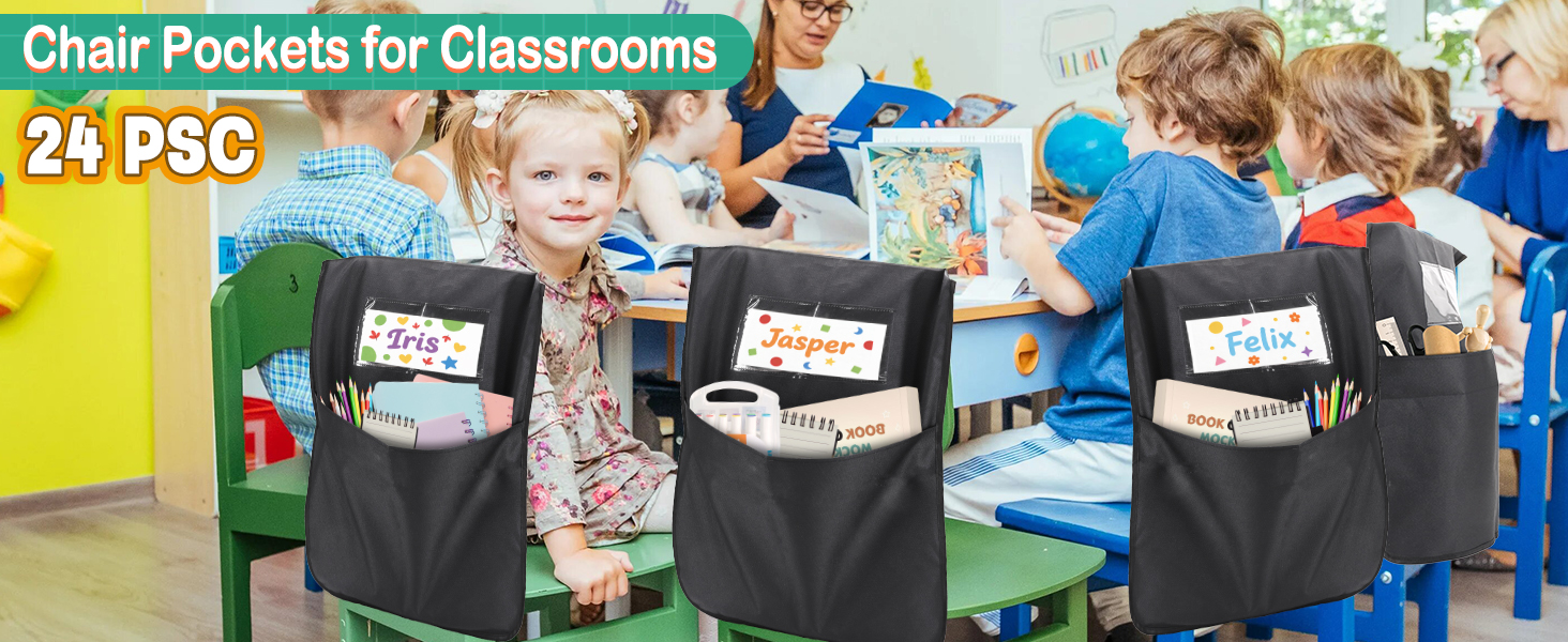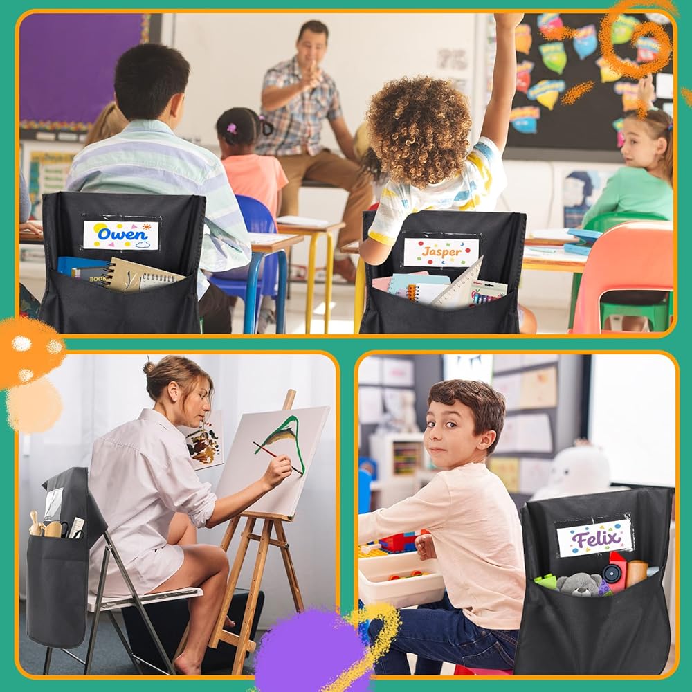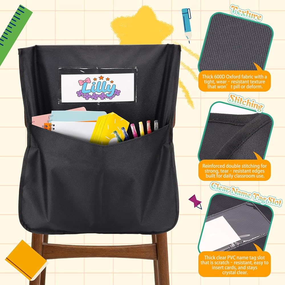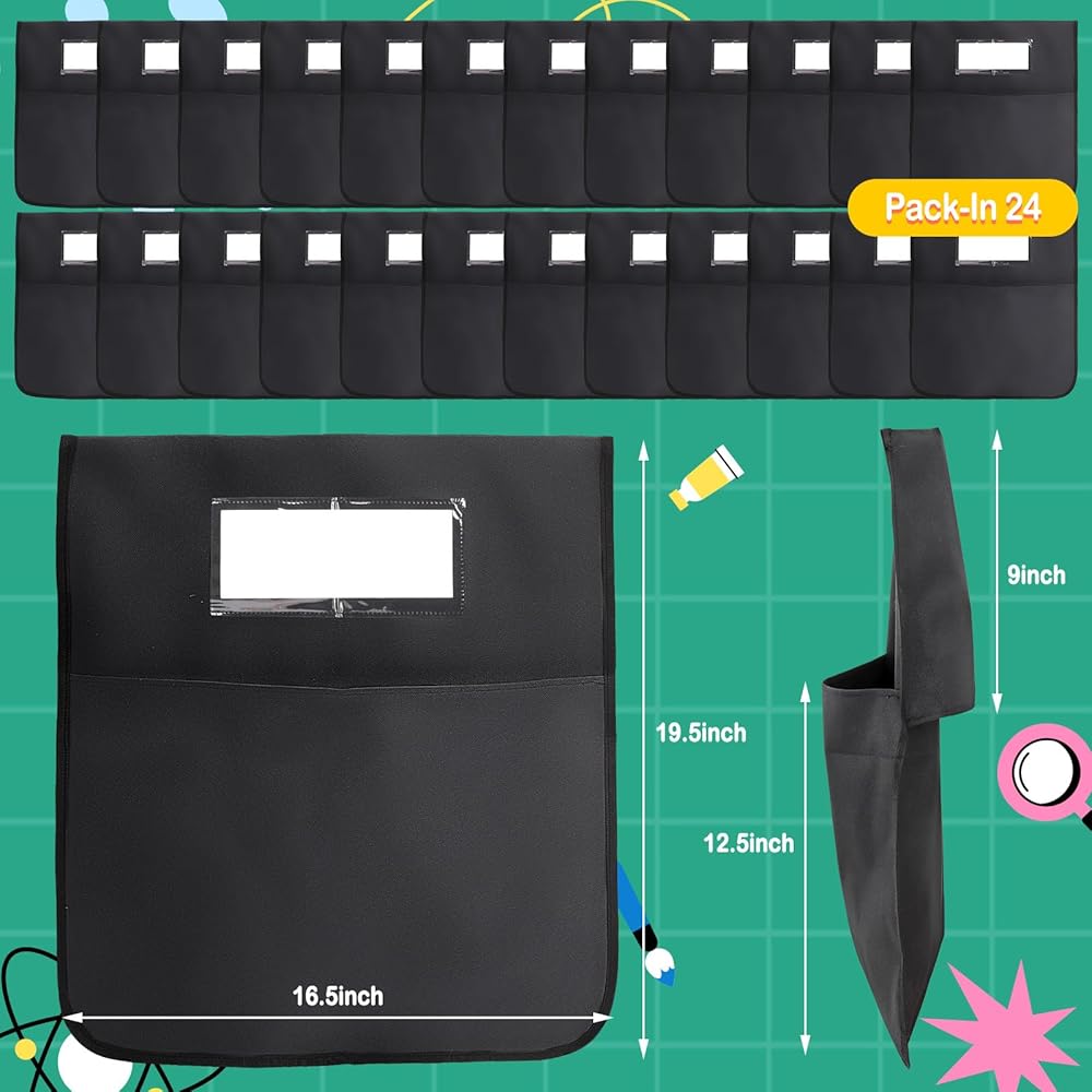 24 حزمة من جيوب الكراسي للفصول الدراسية، 16.5 بوصة × 19.5 بوصة، منظمات ظهر الكرسي الأسود شديدة التحمل 600D أكسفورد مع علامات الاسم، أكياس مقعد لأساسيات مدرسي العودة إلى المدرسة ومستلزمات رياض الأطفال والصف الثالث
