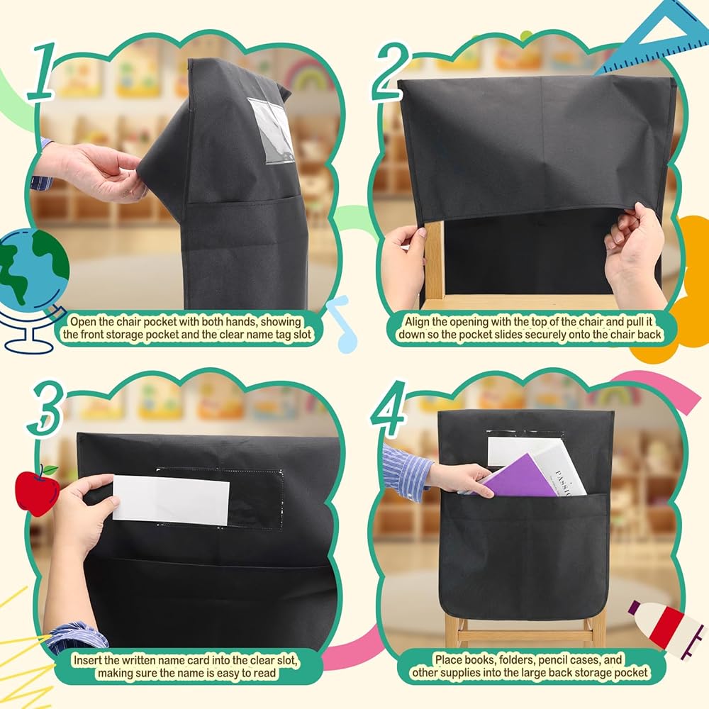 تركيب سهل سهل الارتداء، لا حاجة لأي أدوات، فقط قم بتمريره على ظهر الكرسي القياسي بأمان. حواف معززة تمنع التمزق والانزلاق، مما يوفر الوقت للمعلمين أثناء إعداد الفصل الدراسي
