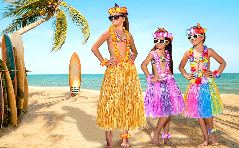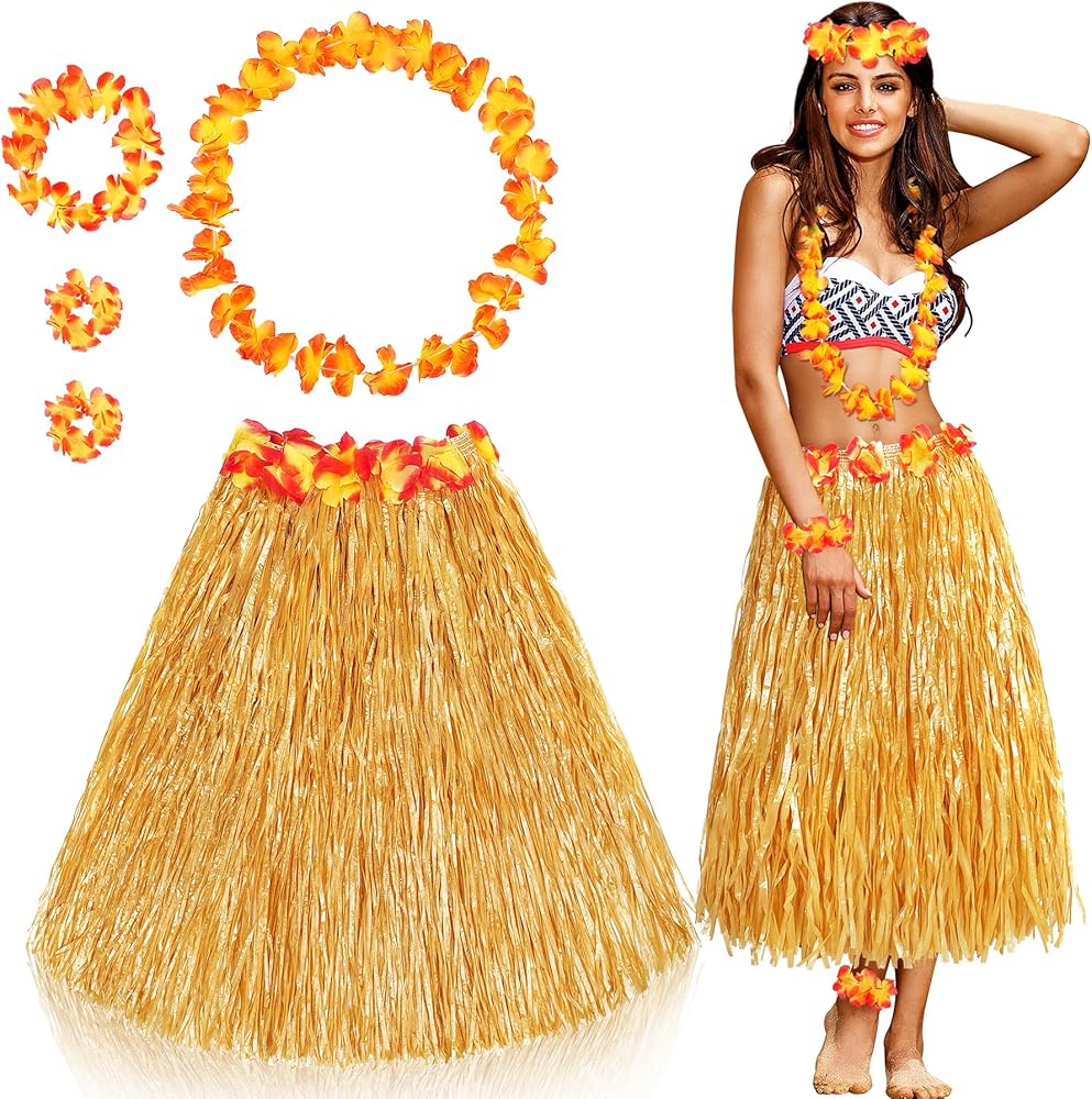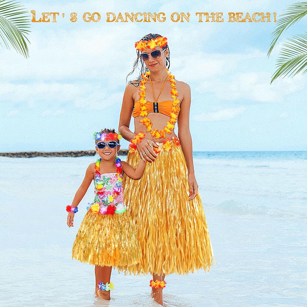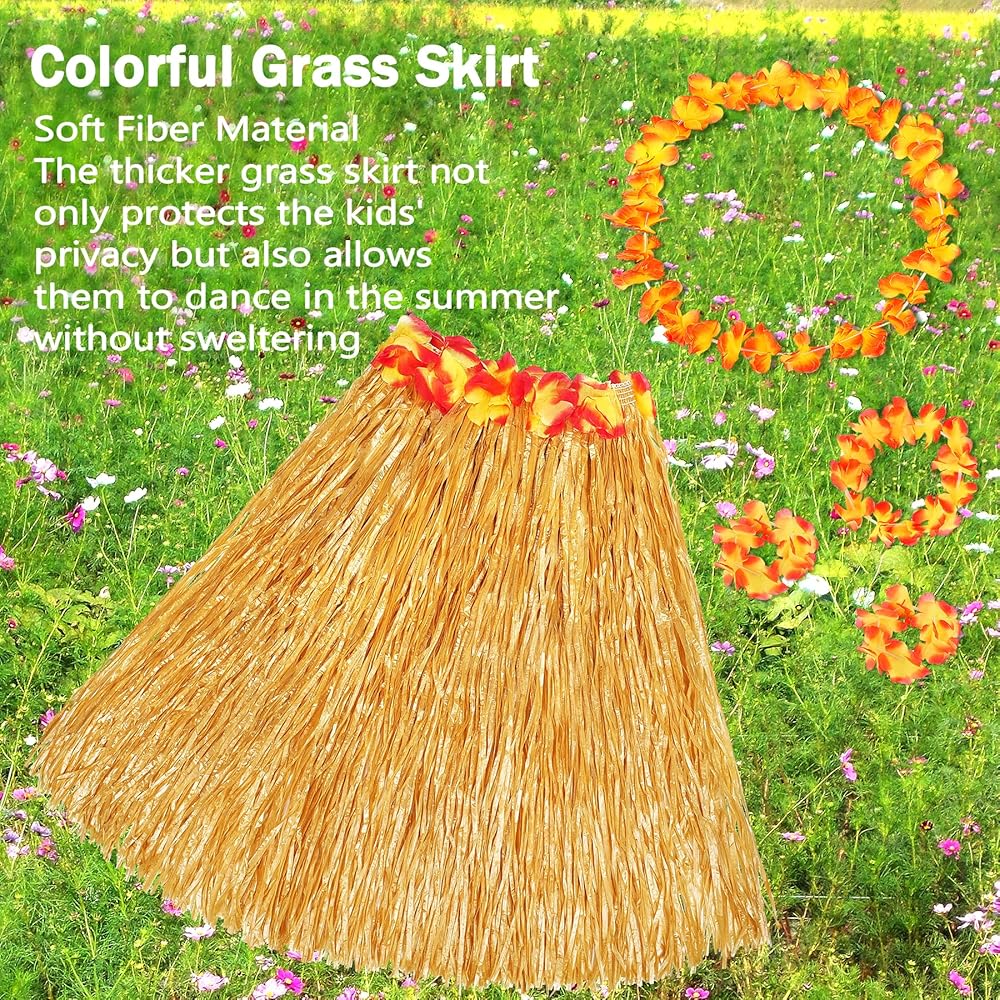 مجموعة تنورة عشب هاواي تأتي مع 5 قطع، تتضمن 1x تنورة عشبية، 1x عصابة رأس على شكل زهرة، 1x قلادة هاواي، و2x سوار معصم، مثالية لمجموعتك الصيفية.