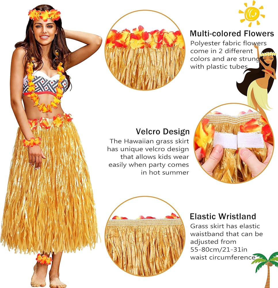 حزام خصر تنورة عشب هاواي قابل للتعديل ومرن بحيث يمكن تمديد محيط الخصر من 55 سم/21.6 بوصة إلى 80 سم/31 بوصة، ويمكن ارتداؤه من قبل النساء البالغات ذوات الأوزان المتعددة. يبلغ طول التنورة الصيفية 80 سم/31.49 بوصة، ويمكن أيضًا أن ترتديه النساء الأطول. بينما يأتي حزام الخصر مع شريط فيلكرو للإغلاق، فهذا يعني أنه عندما تقترب حفلة لوا من نهايتها، لا تحتاج الفتيات للذهاب إلى غرفة تغيير الملابس، فقط قم بخلعها في ثوانٍ والعودة إلى المنزل!