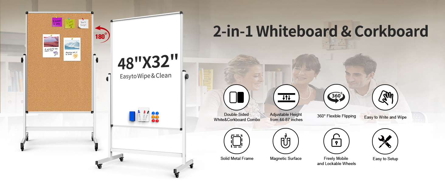 سبورة بيضاء دوارة ولوحة فلين 2 في 1: سبورة بيضاء متنقلة على الوجهين مع لوح مسح جاف مغناطيسي ولوحة فلين ذاتية الشفاء. سطح أملس ومضاد للخدش للكتابة، ولوحة الفلين تحمل المستندات ذات دبابيس الدفع.