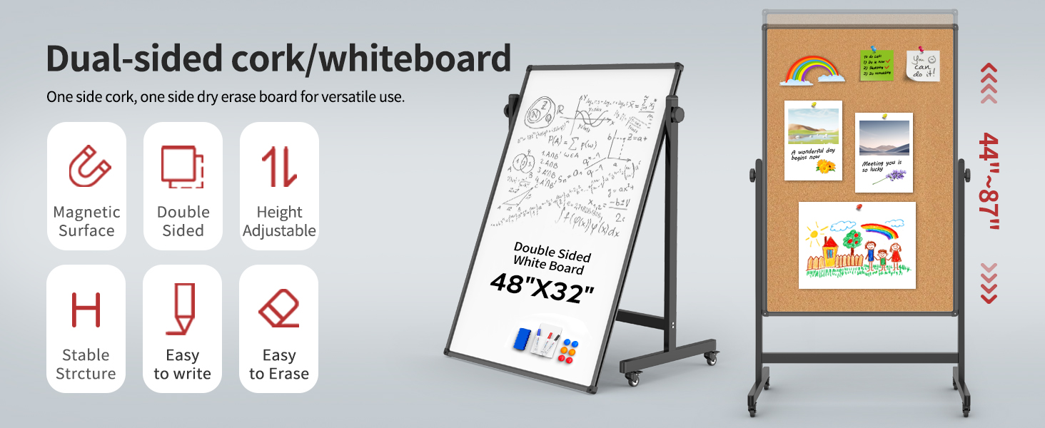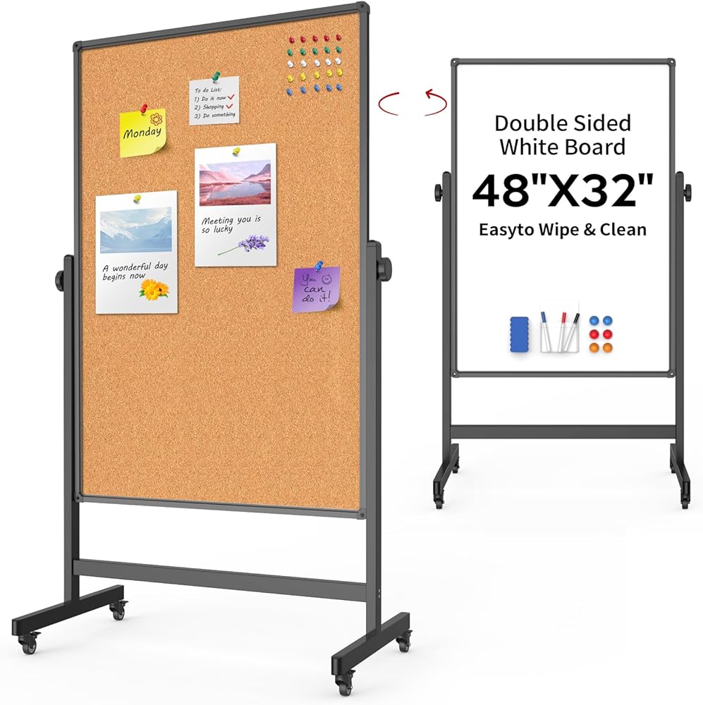 لوحة بيضاء من الفلين على الوجهين، لوحة مسح جافة مقاس 32 × 48 بوصة على عجلات، ارتفاع قابل للتعديل، لوحة قائمة بذاتها محمولة للمكتب والتخطيط والعروض التقديمية (الفلين والأسود)