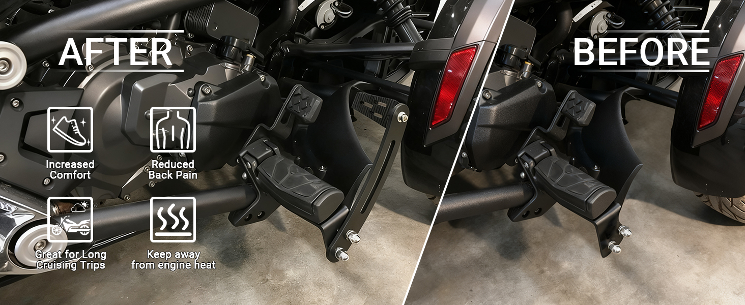 【راحة للقيادة لمسافات طويلة】يمكن لمجموعة أوتاد القدم على الطرق السريعة أن توفر تجربة قيادة أكثر راحة، خاصة أثناء الرحلات الطويلة، ويمكن أن توفر دعمًا أكثر راحة للساق وفقًا لاحتياجاتك الفعلية، وتحفظ بعيدًا عن مصدر حرارة المحرك.