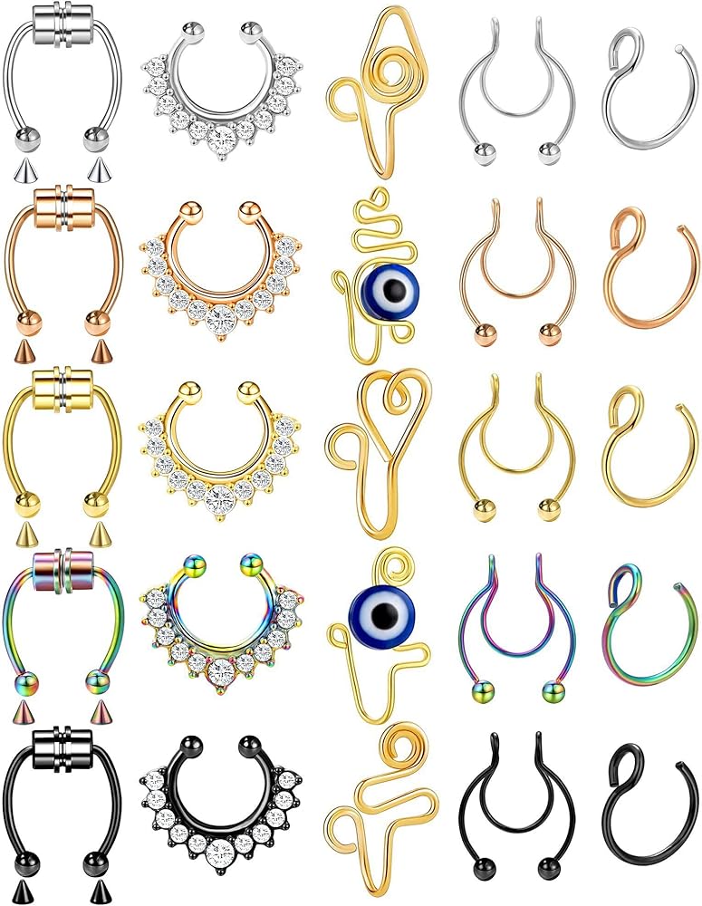 [حلقة أنف مزيفة من الستانلس ستيل]: 25 قطعة من حلقات الأنف المزيفة - حلقات بمشبك وحلقات مزيفة مرصعة بالزركونيا المكعبة وحلقات على شكل حرف C وحلقات حدوة حصان وحلقات أنف أفريقية. مثالي للارتداء اليومي ومريح للارتداء طوال اليوم ولا يسقط بسهولة. حلقات الأنف الملونة هذه هي أيضًا طريقة رائعة لتجربة مظهر الثقب قبل الحاجة إلى الخضوع لمسدس الثقب.