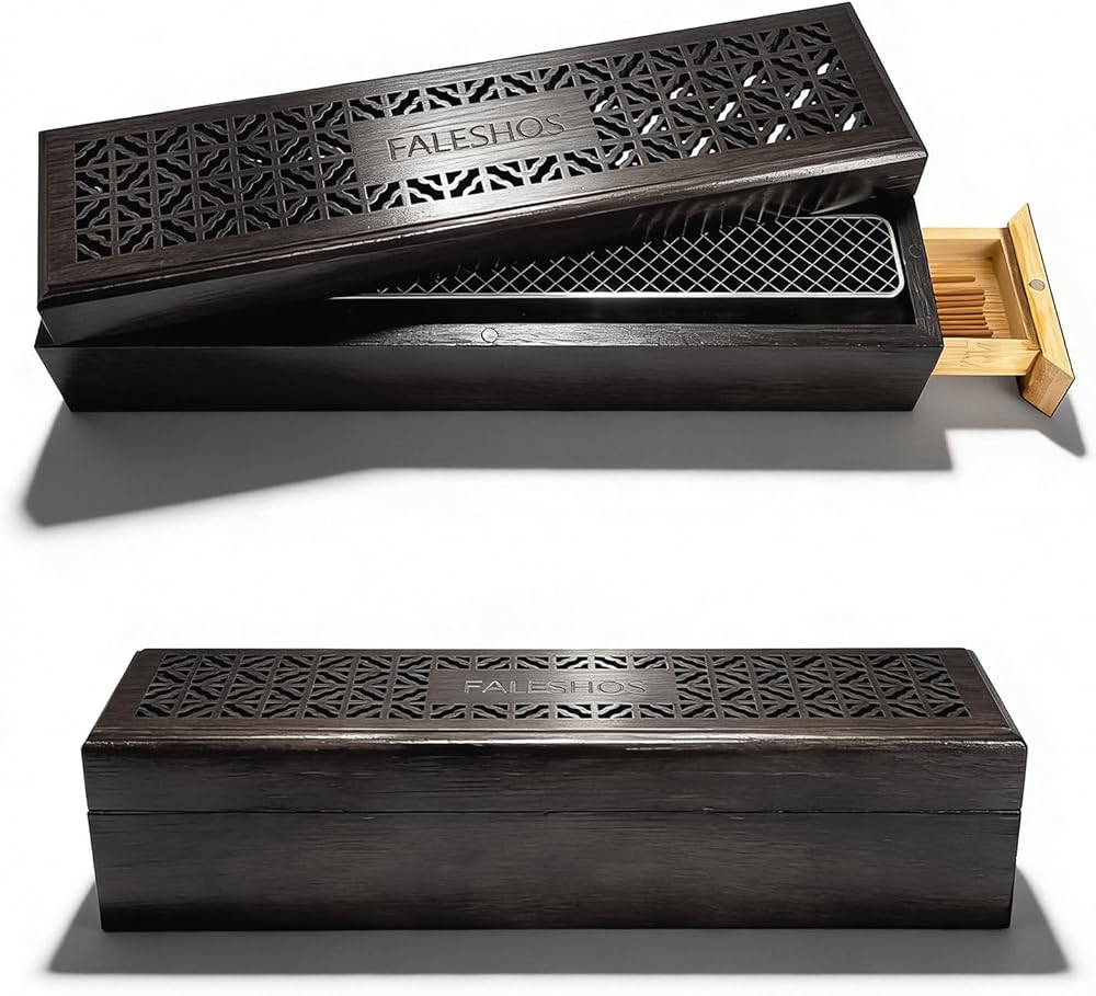 • Double-Layer Design with Lid & Drawer Features a two-level wooden structure with a top lid to prevent ash dispersal, even with ventilation, and a built-in tray for easy ash catching. The bottom drawer provides convenient storage for your incense sticks, keeping the sticks organized and dry.