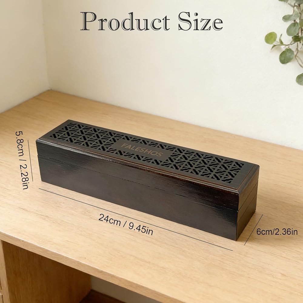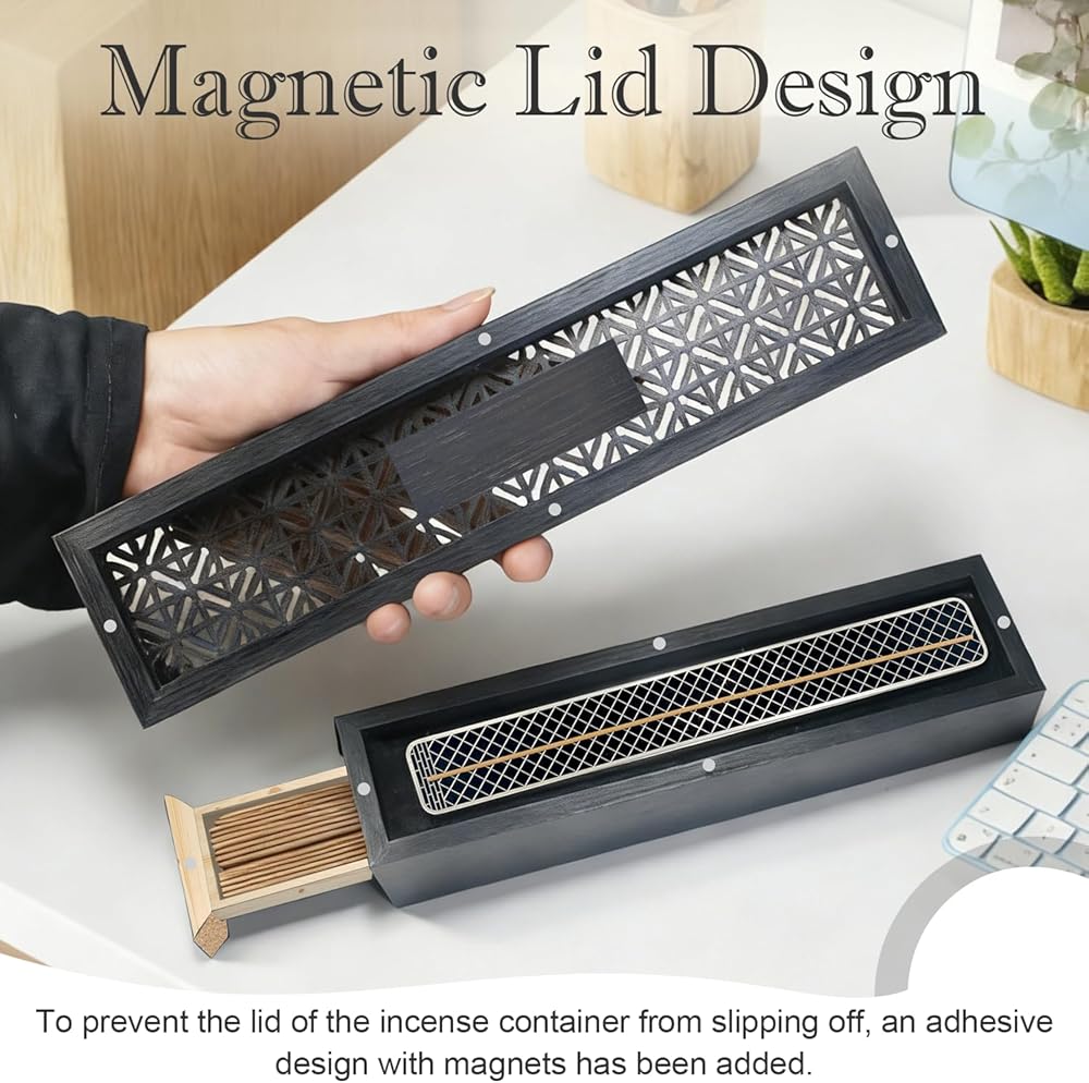 Discover the complete solution for your aromatic rituals with our Incense Box Set. This set includes a beautifully crafted brown incense box (9.45"L x 2.36"W x 2.36"H), paired with an 8.62"x1.18" stainless steel mesh and an 8.86"x1.77" heat-resistant mat, designed to make tedious cleaning a thing of the past. Crafted from beautiful and sturdy natural wood, it features an intelligent two-level design. The top lid prevents ash from dispersing, even with gentle air movement, while the built-in ash-catching tray and convenient bottom drawer keep your incense sticks organized, dry, and easily accessible