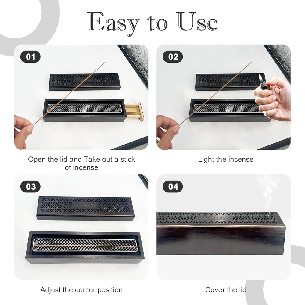 • Product Set This set includes a 9.45*2.36*2.36-inch brown incense box, paired with an 8.62*1.18-inch stainless steel mesh and an 8.86*1.77-inch heat-resistant mat. Say goodbye to tedious cleaning. Excellent for meditation, wellness practices, or spiritual rituals.