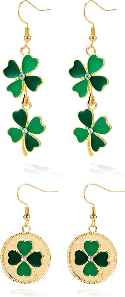 Double Lucky & Style: تتضمن هذه المجموعة زوجين من أقراط نبات النفل لعيد القديس باتريك، وتصميم كلاسيكي للعملات الأيرلندية مع البرسيم في المنتصف وتصميم مرح مكدس مزدوج النفل. ارفع على الفور ملابس عيد القديس باتريك الخاصة بك واصبح حياة الحفلة مع هذه الأقراط الجذابة التي تشع بالسحر الأيرلندي والحظ السعيد.