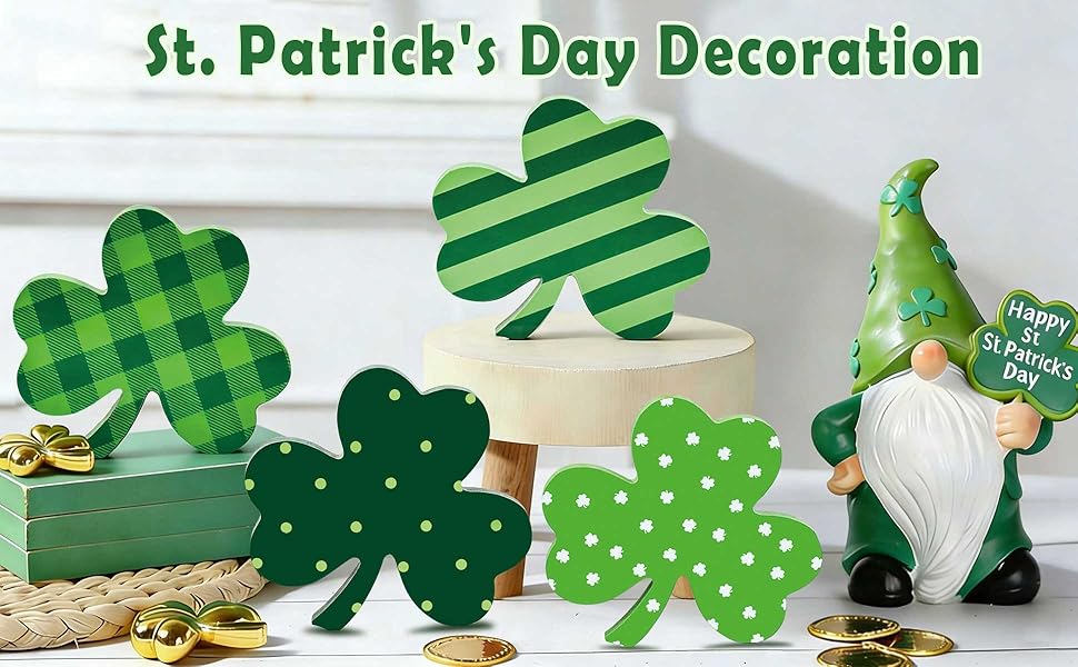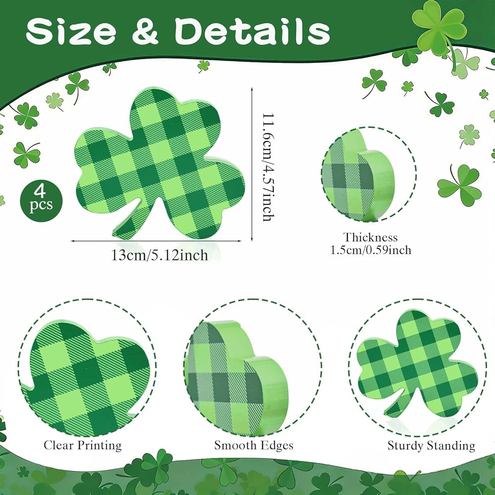 【حجم ووزن مناسبان】 ديكورات شامروك ذات جودة عالية في البناء والطلاء. يبلغ ارتفاع ديكورات الطاولة هذه 4.6 سم تقريبًا وعرضها 5.1 سم، وسمكها 0.59 سم. لديهم وزن وحجم جيد، لذلك لا يشعرون بالضعف ويجلسون بثقة دون خوف من الانقلاب