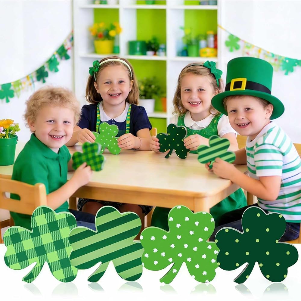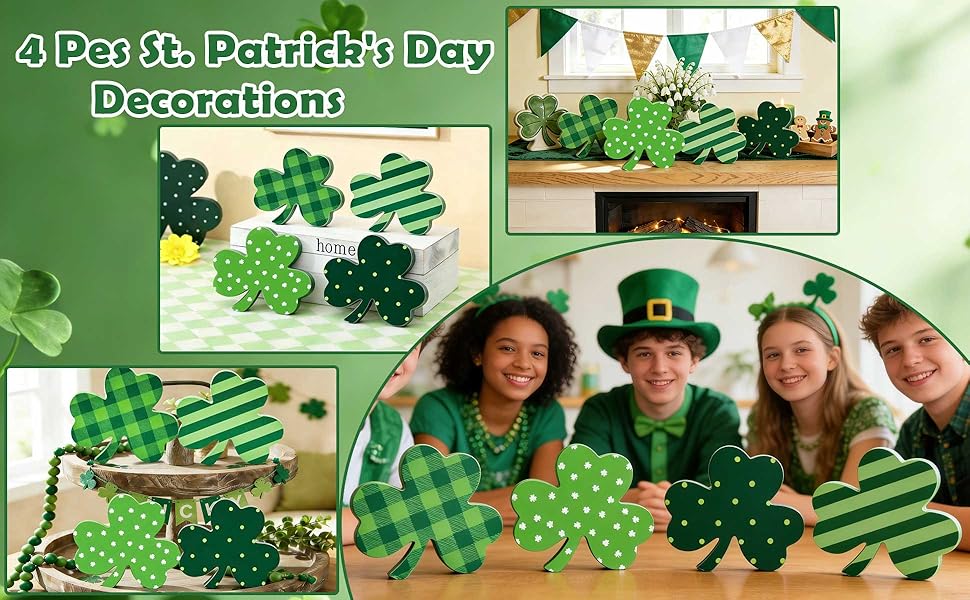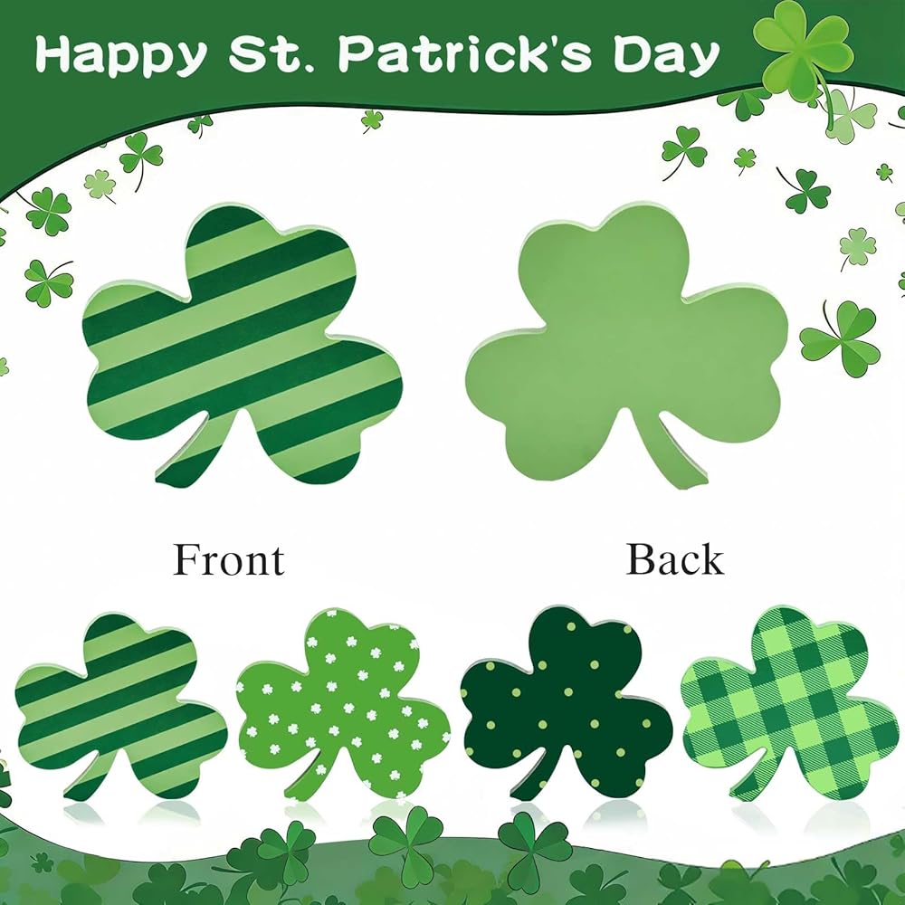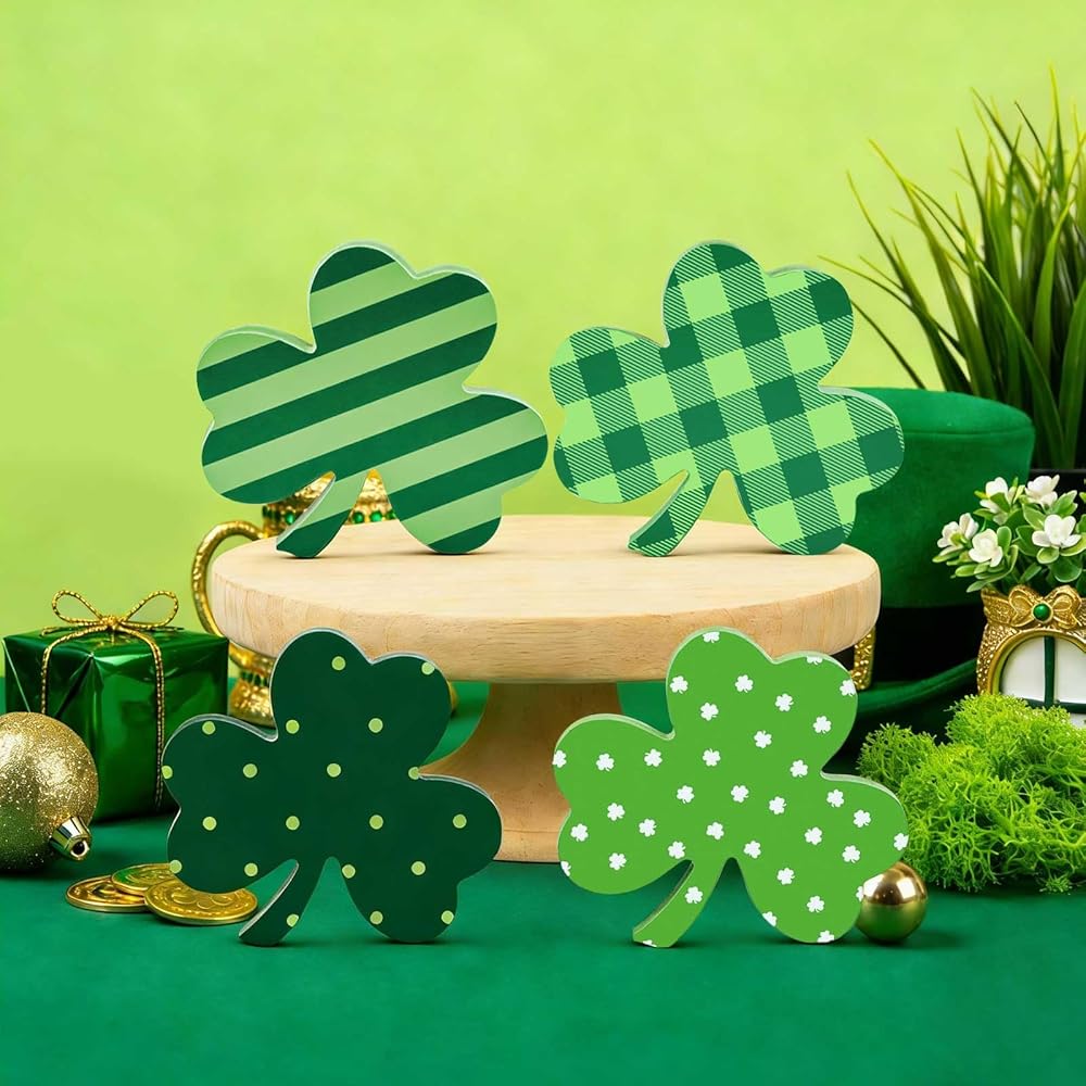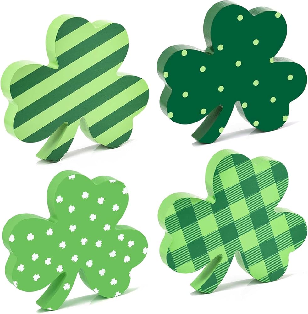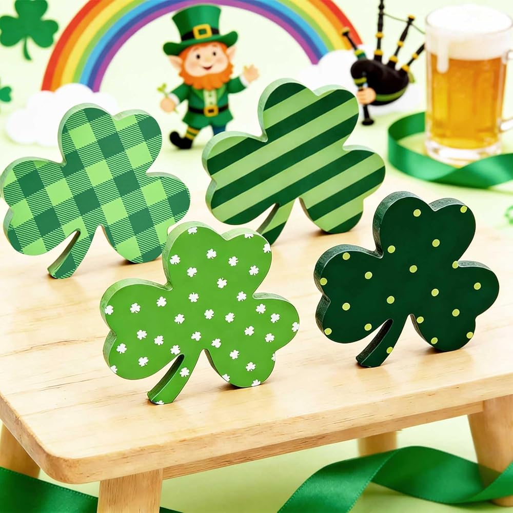 【قيمة رائعة】 مجموعة ديكور عيد القديس باتريك من لولبيا تأتي مع 4 أحجار شامروك خشبية إجمالاً. تتميز كل لافتة خشبية بنمط مختلف، لذلك يمكن لهذه البرسيم غريبة الأطوار إضافة لمسة من الألوان الموسمية إلى أي غرفة