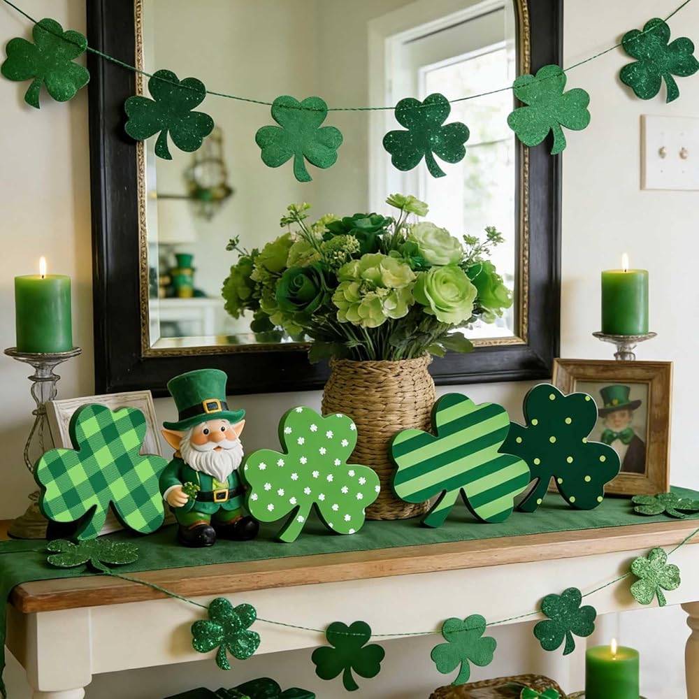【تصميم لافت للنظر】مصممة على شكل نباتات النفل الكلاسيكية، تتميز القطع المركزية لعيد القديس باتريك بألوان خضراء داكنة وخضراء فاتحة مع أنماط منقوشة الجاموس والنقاط والخطوط والبرسيم. تضيف تصميماتها الفريدة سحرًا خاصًا وتجلب الحظ إلى منزلك