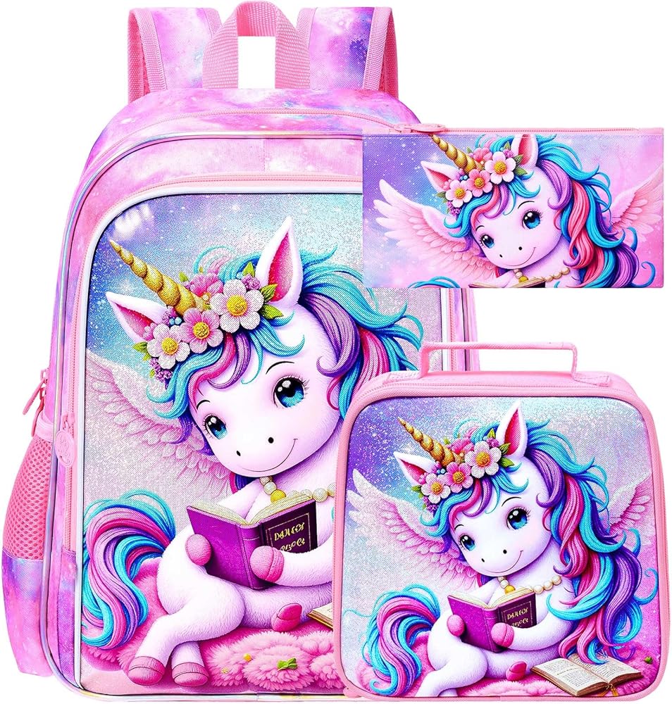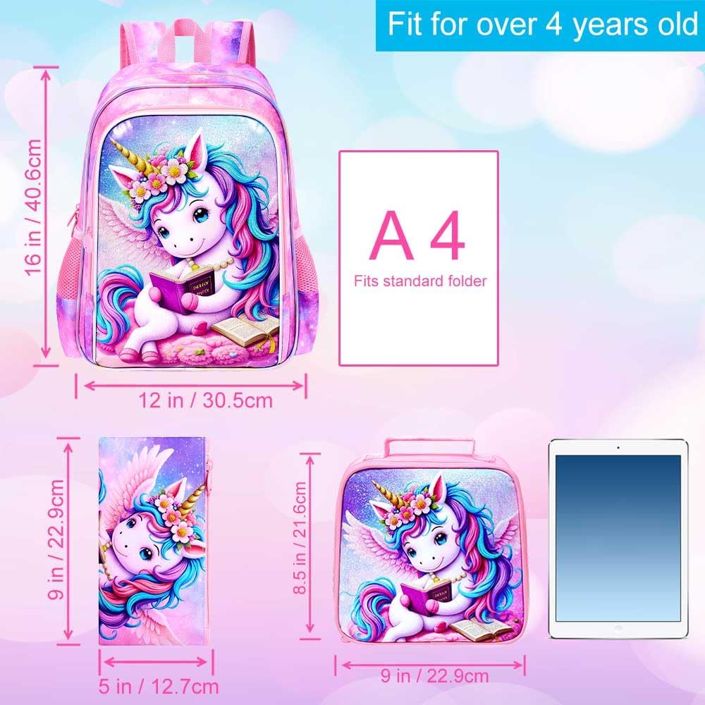 • Unicorn Backpack Set: Designed for multiple occasions, this set includes a girls backpack (16"*12"*6.5"), a unicorn lunch bag (9"*8.5"*3.5"), and a pencil case—a 3-piece series that brings extra joy to your child.