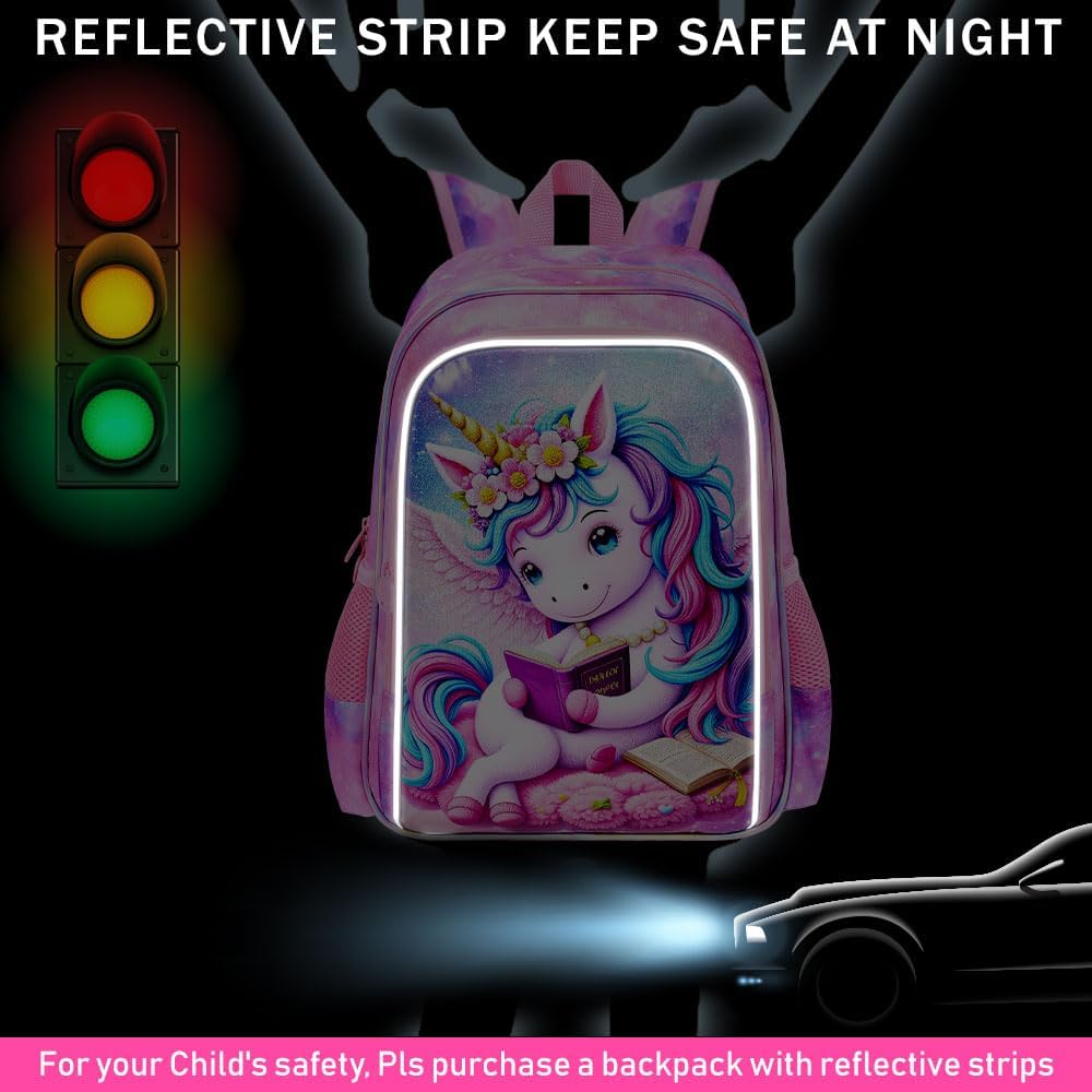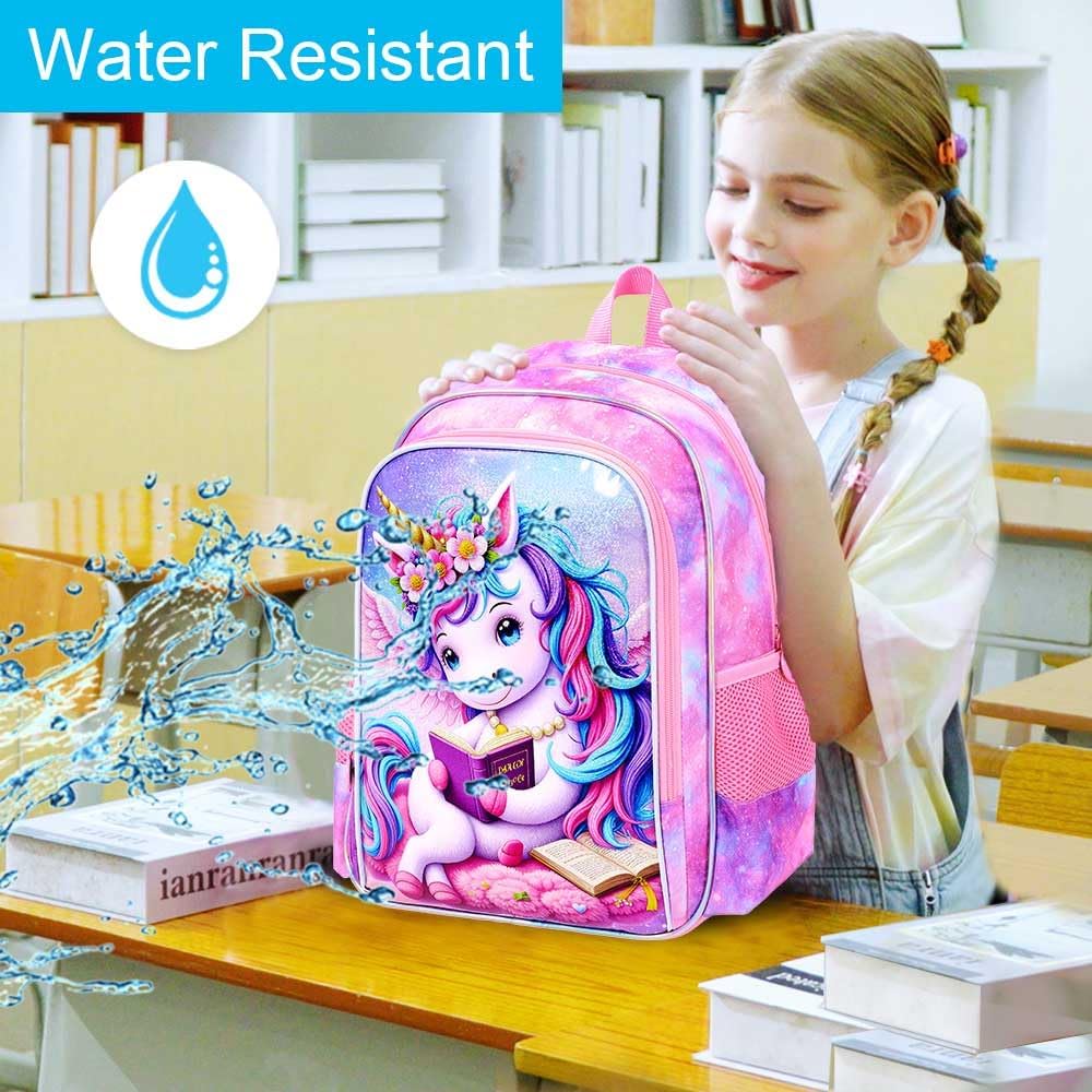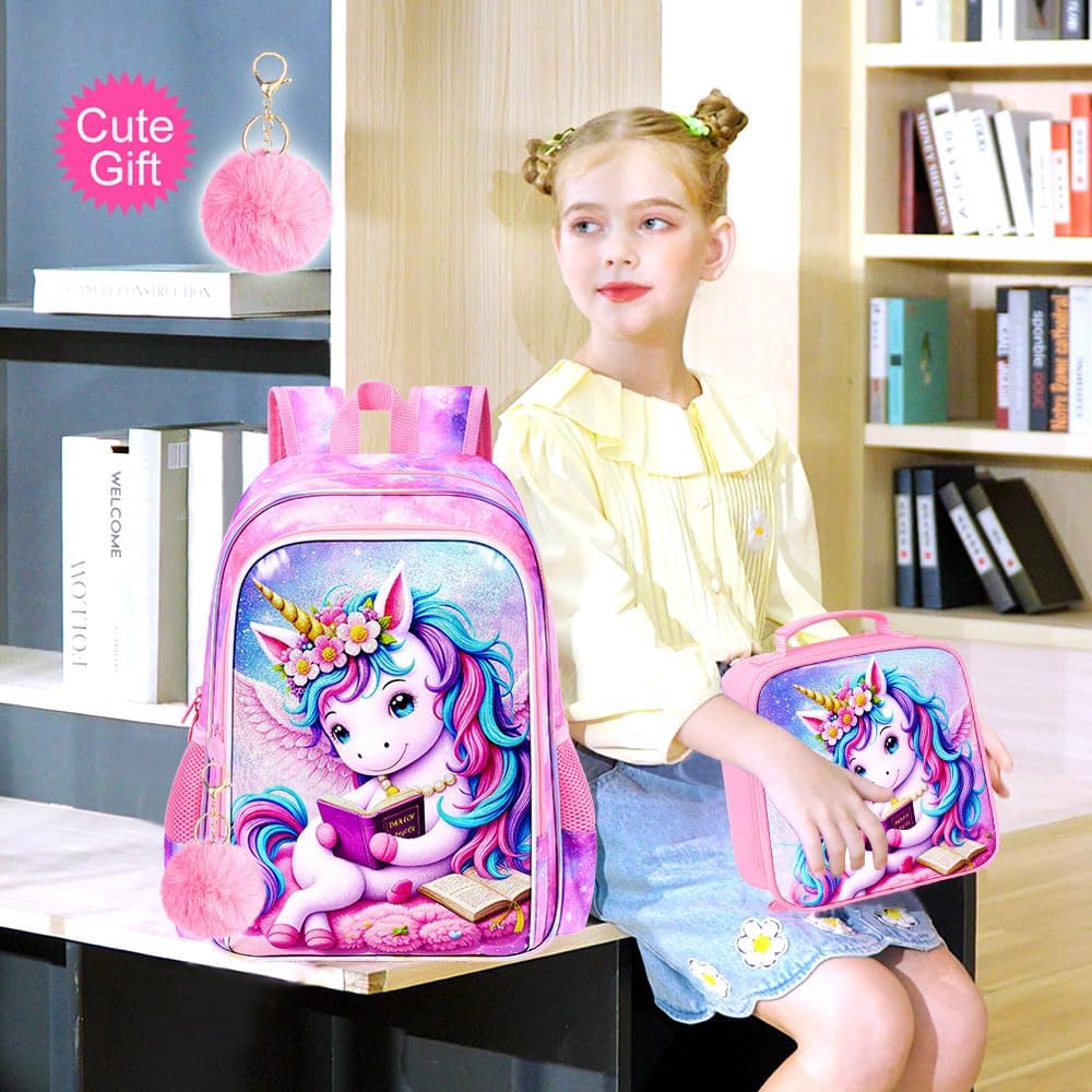 3PCS Girls Unicorn Bookbag Set, 16" Kids Backpack with Lunch Box, Water-Resistant School Bag for Elementary, Preschool & Toddler - Relaxed Reading Unicorn Pink