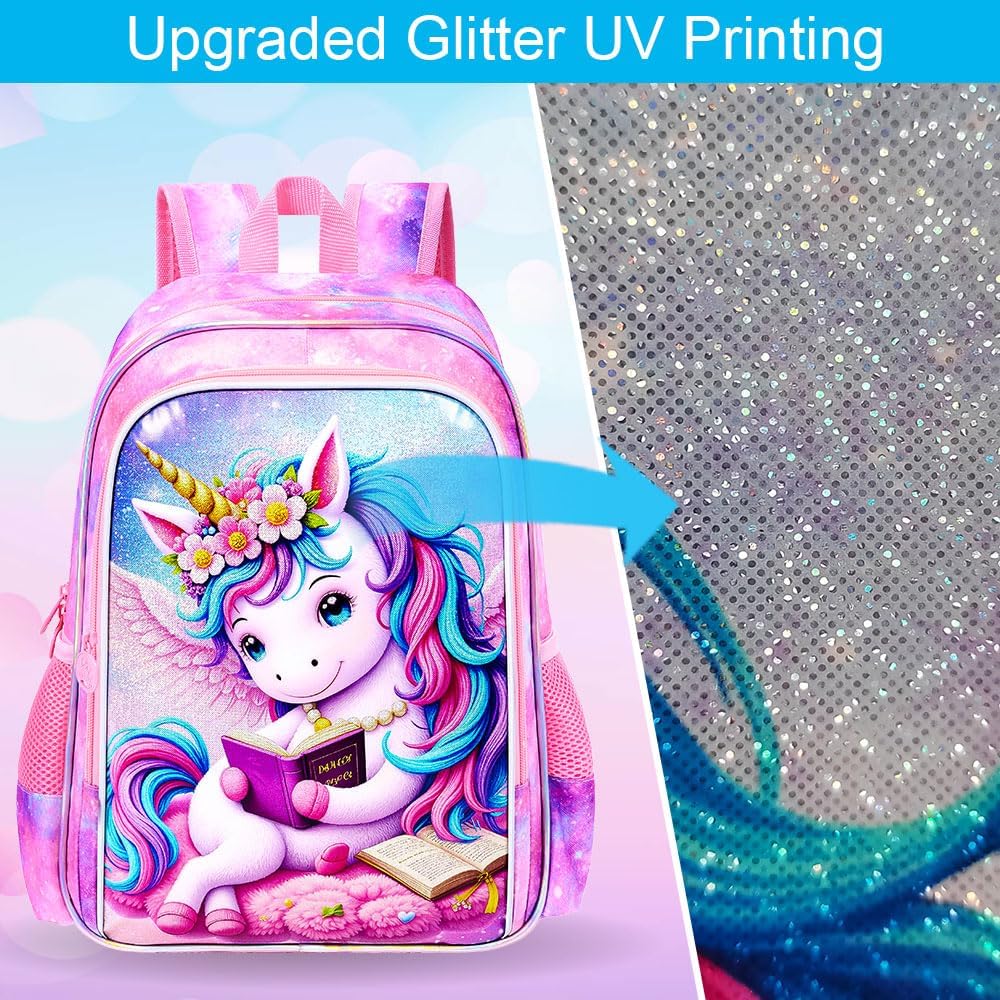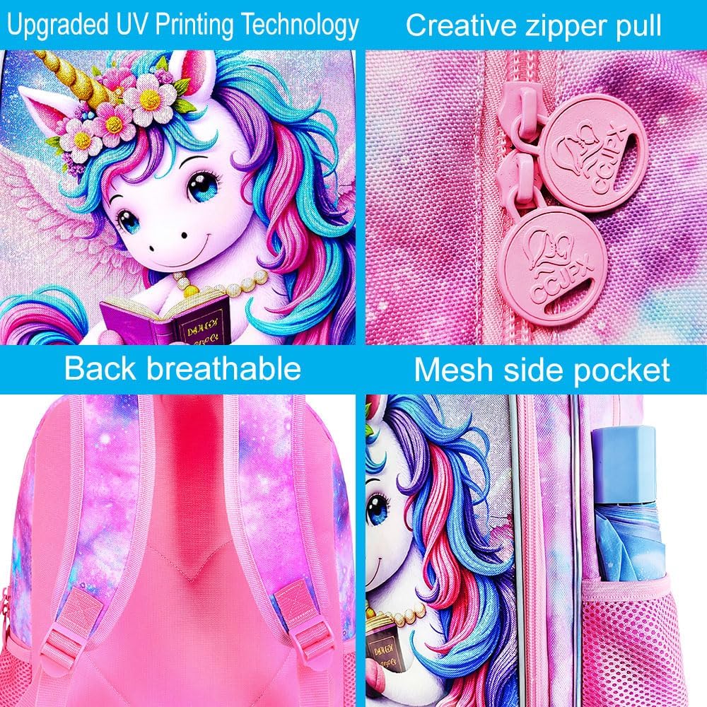 • Backpack for Girls Details: Reinforced side mesh pockets and strap links, padded, breathable shoulder straps, and smooth double zips—all these features make the girls unicorn backpack more durable.