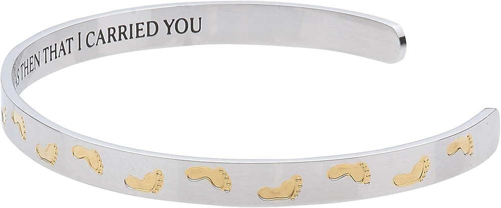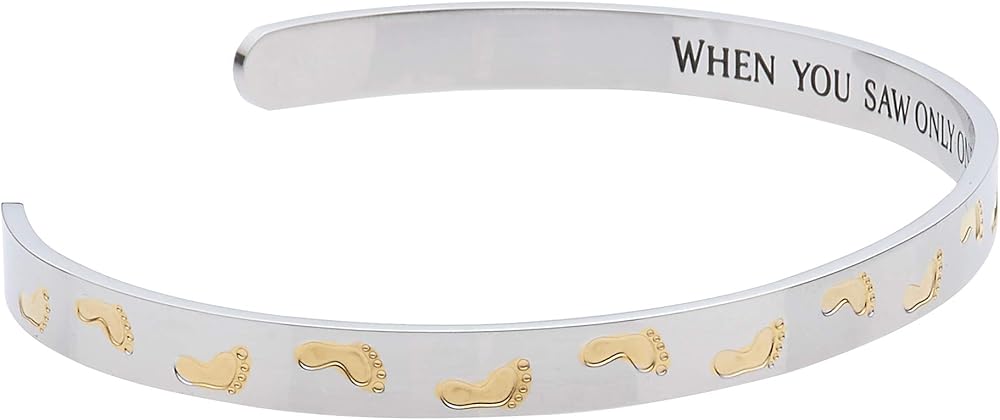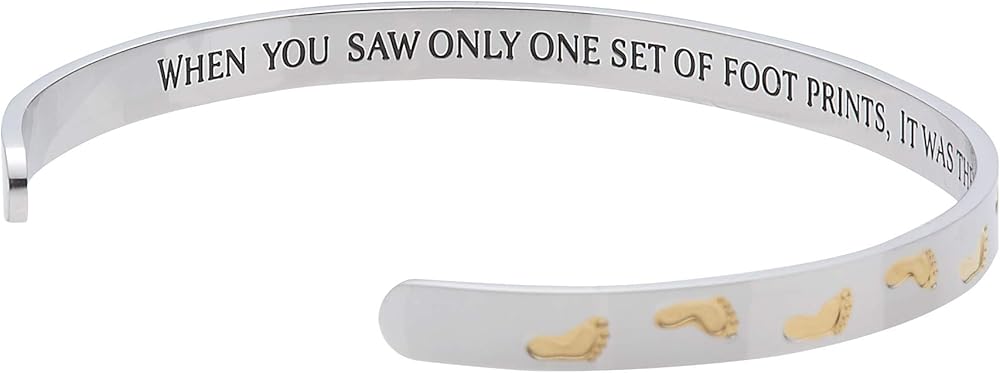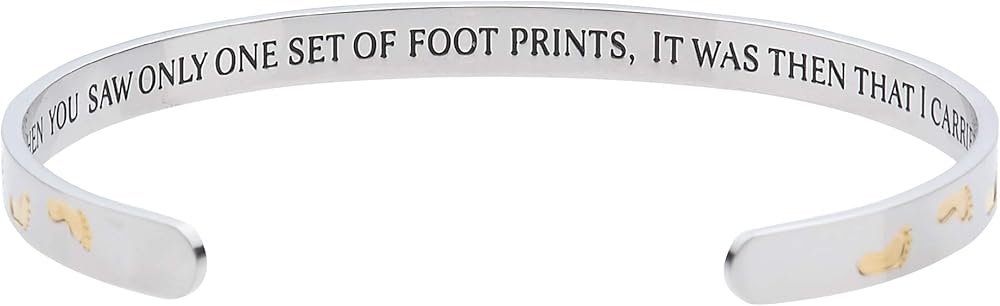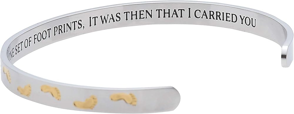 A sentimental gifts for friends and family. "When you saw only one set of footprints it was then that I carried you" engraved on this beautiful bracelet cuff.