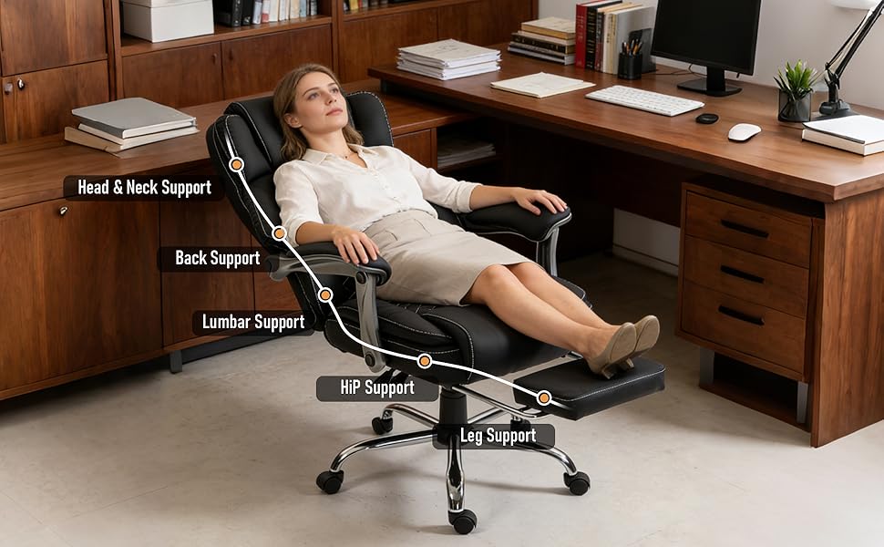 تصميم مريح: يتميز كرسي المكتب هذا المزود بمسند للقدم بوسادة مقعد واسعة وسميكة مع إسفنج مزدوج الطبقة عالي المرونة ونوابض جيبية مستقلة. يوفر دعمًا استثنائيًا، ويقلل من ضغط الورك، ويتضمن مسند رأس محيطي، ومسند ظهر عريض جدًا، ودعم أسفل الظهر. مصمم ليكون كرسي مكتب كبير وطويل، فهو يخفف من تعب الرقبة وأسفل الظهر أثناء جلسات العمل أو الدراسة أو الألعاب الطويلة.