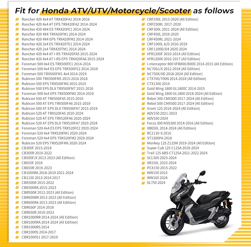 Fitment: Fit for Honda CBR1000S 2014-2017▶CBR1000S1 2017-2019▶CRF250L 2013-2020▶CRF250RL 2017-2020▶CRF300L 2021-2024▶CRF450L 2019-2020▶CRF450RL 2021-2024▶CRF1000L A/D 2016-2019▶CRF1100D/D4 2020-2024▶VFR1200F 2010-2014▶VFR1200X 2016-2017▶I-nterceptor 800▶VFR800/800D 2014-2015▶NC700J/X 2012-2018▶NC750X/XD 2018-2024▶CTX700/700N 2014-2018▶CTX1300 2014▶Gold Wing 1800 GL1800C 2014-2015▶Gold Wing 1800 GL1800 2018-2024▶Rebel 300 CMX300 2017-2024▶Rebel 500 CMX500 2017-2024▶Grom 125 2014-2024(Please see the product description for more details)