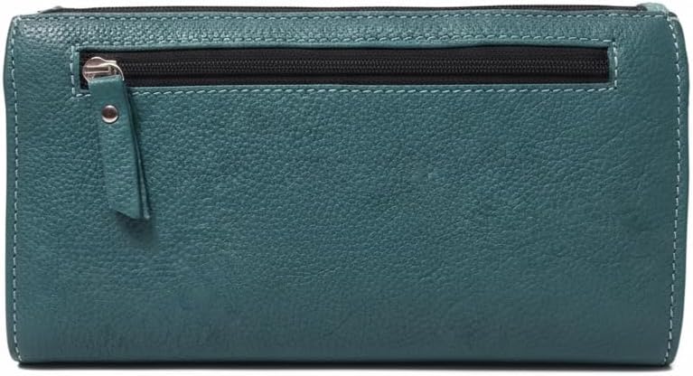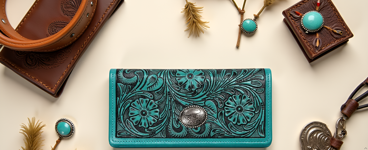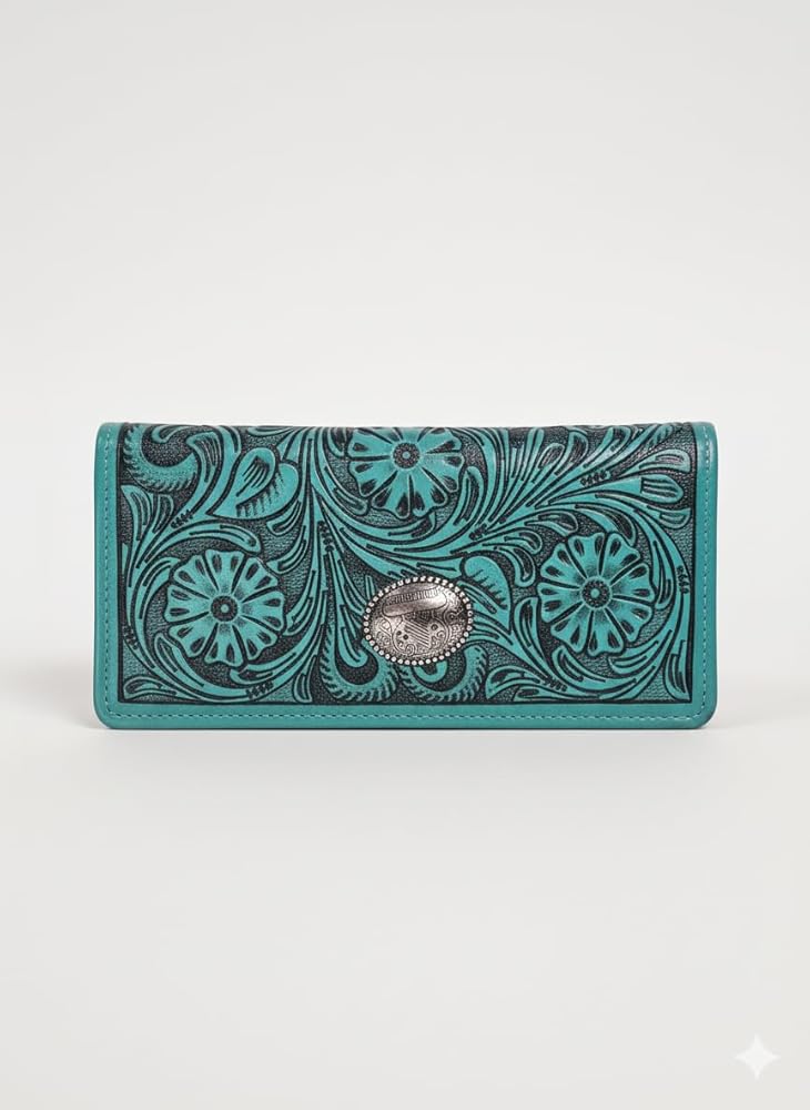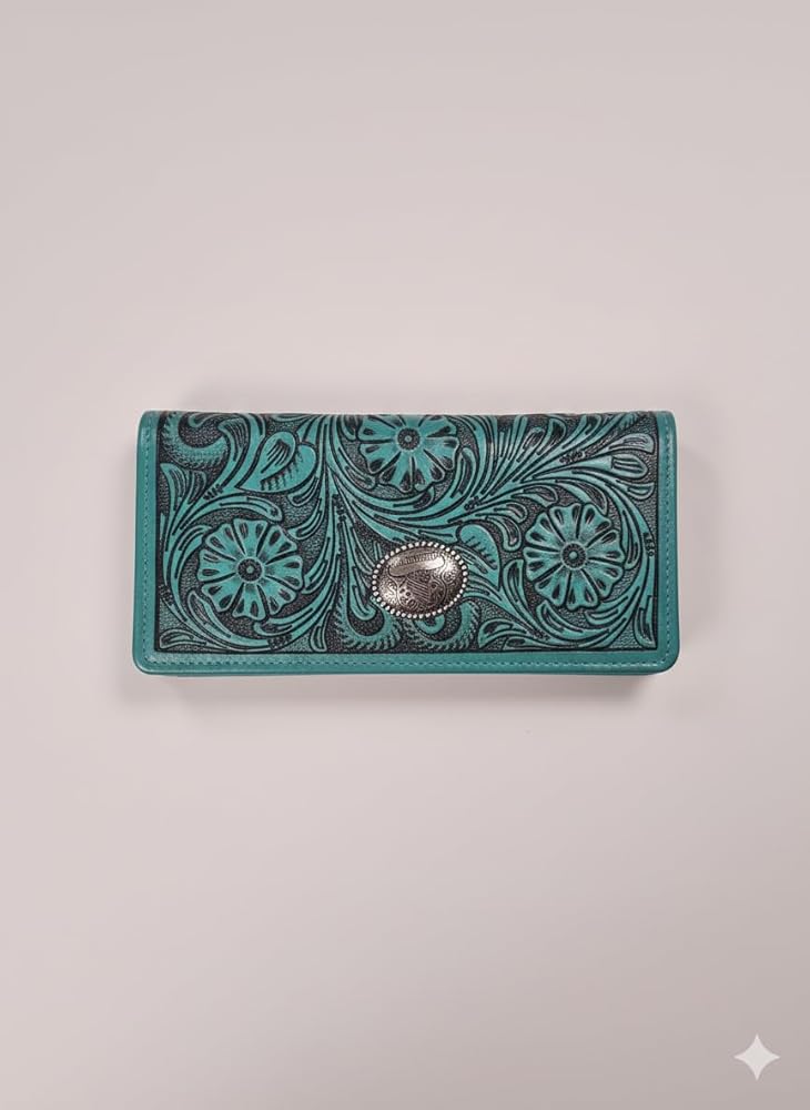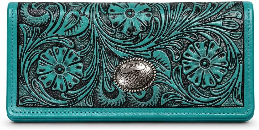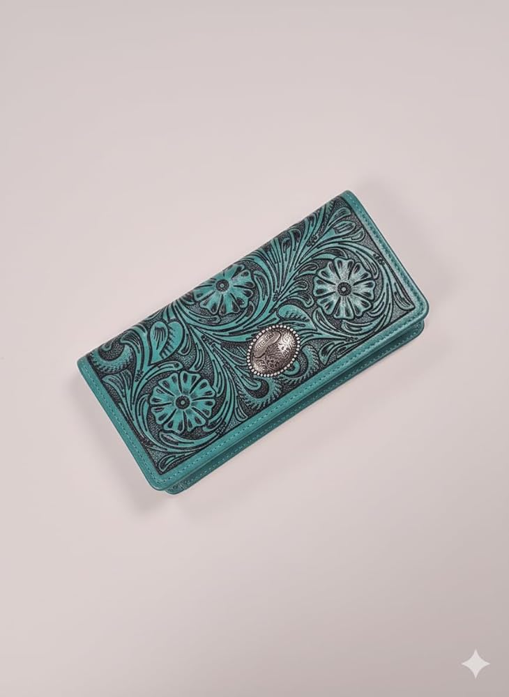 تصميم فيروزي غربي جريء: محفظة جلدية فيروزية نابضة بالحياة تتميز بنقش زهور معقدة لمظهر مذهل مستوحى من راعية البقر