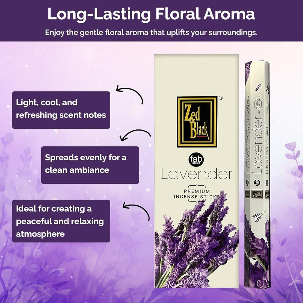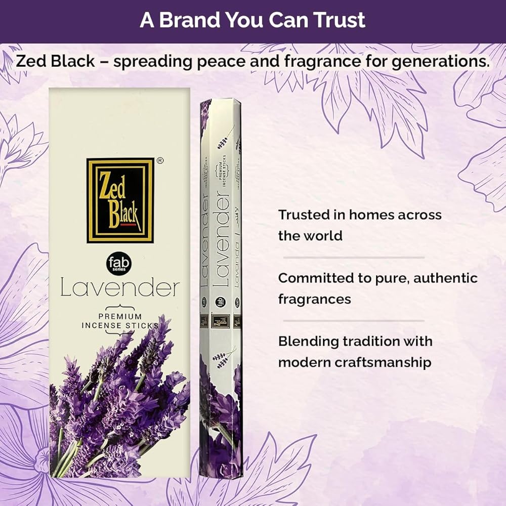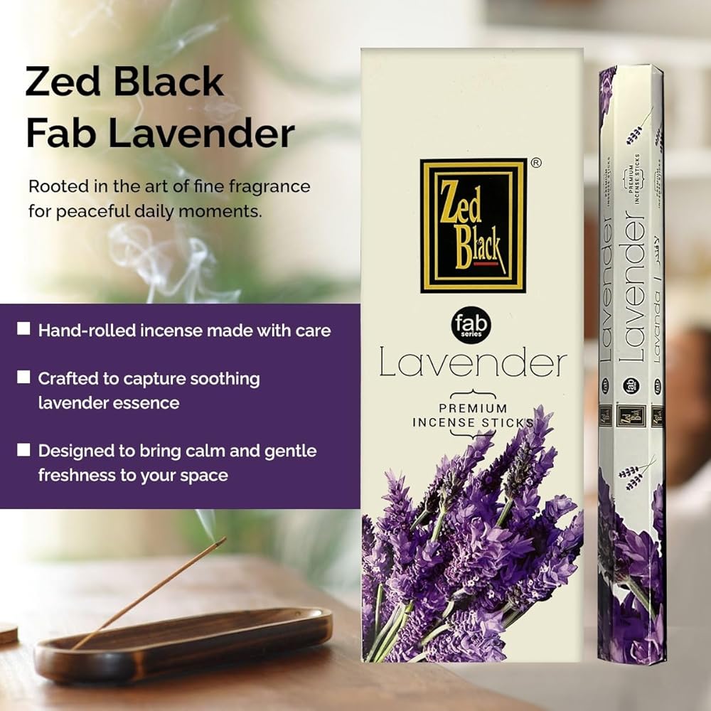 Zed Black Lavender Incense is a premium handcrafted fragrance designed to fill your space with a soft, floral aroma that inspires calmness and comfort. Each stick is hand-rolled using high-quality ingredients to ensure a smooth, consistent burn and a naturally soothing scent.Sustainably made and thoughtfully packed, these incense sticks release a gentle lavender fragrance that creates a peaceful, inviting ambience—perfect for meditation, prayer, yoga, or simple home relaxation. Whether you're setting the mood for quiet reflection or freshening your surroundings, Zed Black Lavender Incense brings a sense of serenity and freshness to any setting.Ideal for daily use in homes, studios, or wellness spaces, this aromatic blend reflects Zed Black's commitment to purity, craftsmanship, and authentic fragrance traditions. Experience the gentle essence of lavender—where nature and mindfulness meet in every burn.