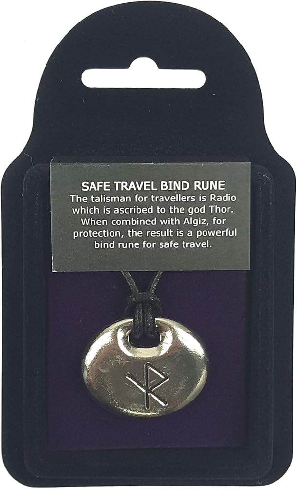 Safe travel bind rune – pewter rune with an engraved runic symbol for safe travel on an adjustable black leather thong. The safe travel bind rune. The talisman for travellers is Radio which is ascribed to the god Thor. When combined with Algiz, for protection, the result is a powerful bind rune for safe travel. The use of bind runes is ancient, probably arising almost simultaneously with the use of runes as an alphabet. Essentially, a bind rune is a symbol composed of several runes overlaid, one on top of another, to form a single character.