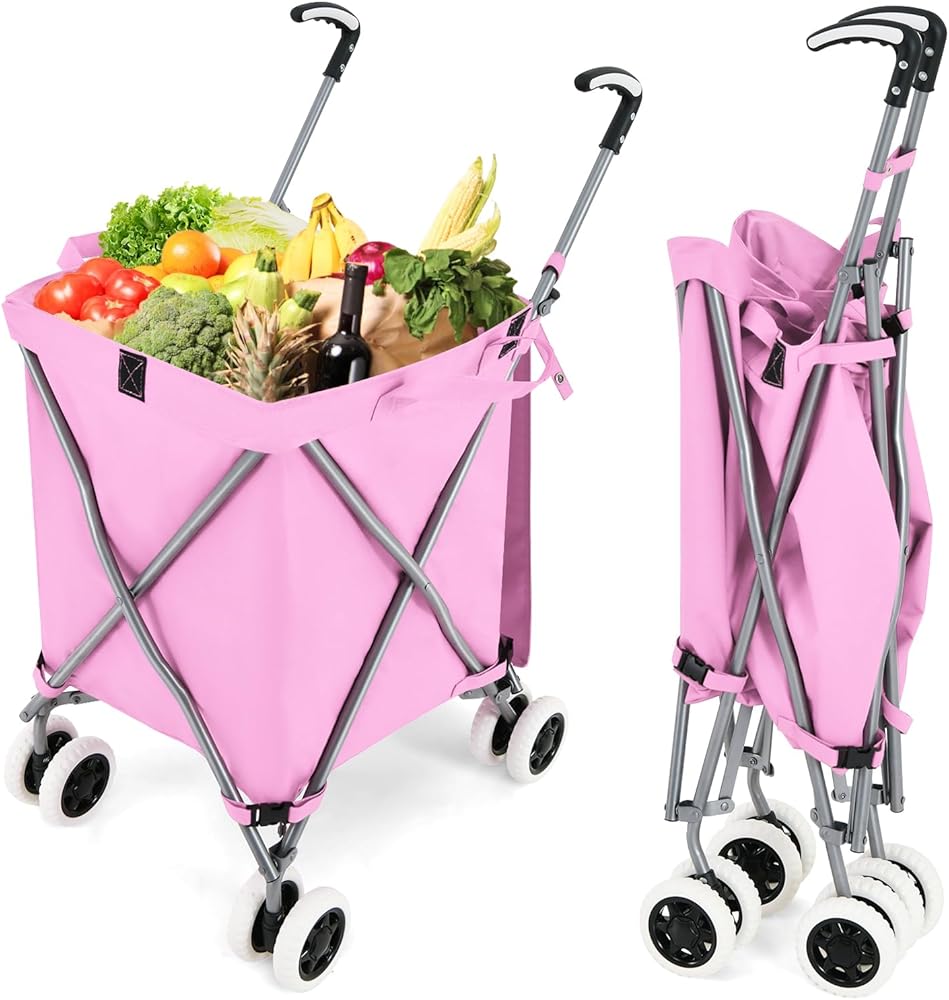 عربة تسوق قابلة للطي على عجلات من GOFLAME، عربة بقالة مقاومة للماء مع غطاء قابل للإزالة وعجلات دوارة 360 درجة، عربة أدوات قابلة للطي للبقالة والغسيل، سعة تحميل 120 رطل، وردي