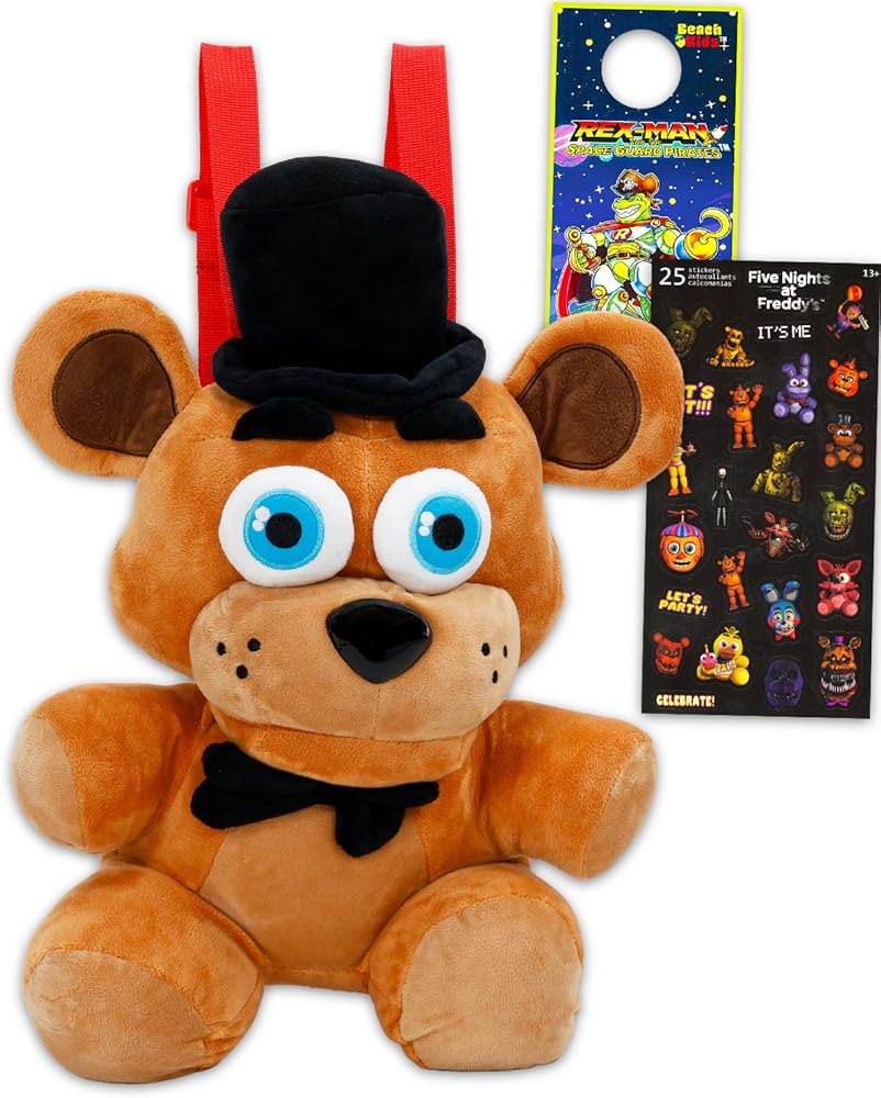 Five Nights at Freddy's Plushie Backpack Set - Bundle with 16" Freddy Plush Doll with Carrying Straps, Stickers, More | FNAF Plush Toy for Kids. This Five Nights at Freddy's backpack set includes one 16" Freddy plush doll with adjustable carrying straps to bring your favorite Five Nights at Freddy's character with you anywhere. Sure to be a hit with Five Nights at Freddy's fans, this Freddy plushie set is great to give as a gift to the Five Nights at Freddy's fan in your life! Take Freddy with you wherever you go! These adjustable shoulder straps keep your FNAF friend on your back with you. Plush features a small compartment for storing small items. Officially licensed Five Nights at Freddy's plushie set for boys and girls alike also comes with Five Nights at Freddy's stickers and a Rex-Man door hanger.