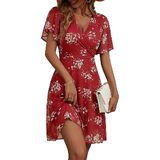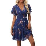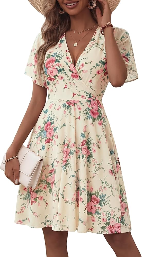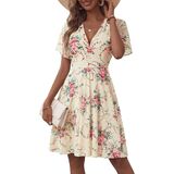 【المميزات: فستان صيفي جذاب برقبة على شكل حرف V وأكمام قصيرة مكشكشة، صورة ظلية على شكل حرف A، خصر إمبراطوري، وطول فوق الركبة. يخلق النسيج المتدفق شكلاً رشيقًا بينما ينعم البطن والوركين بلطف. بسيطة ولكنها أنيقة.