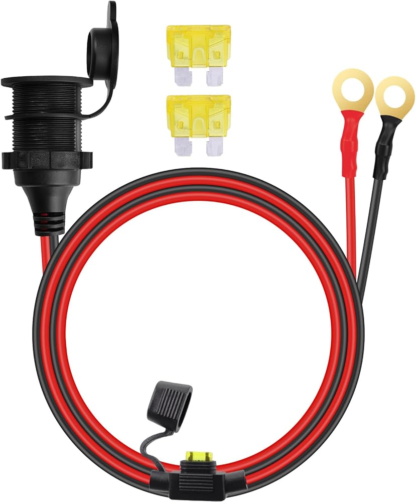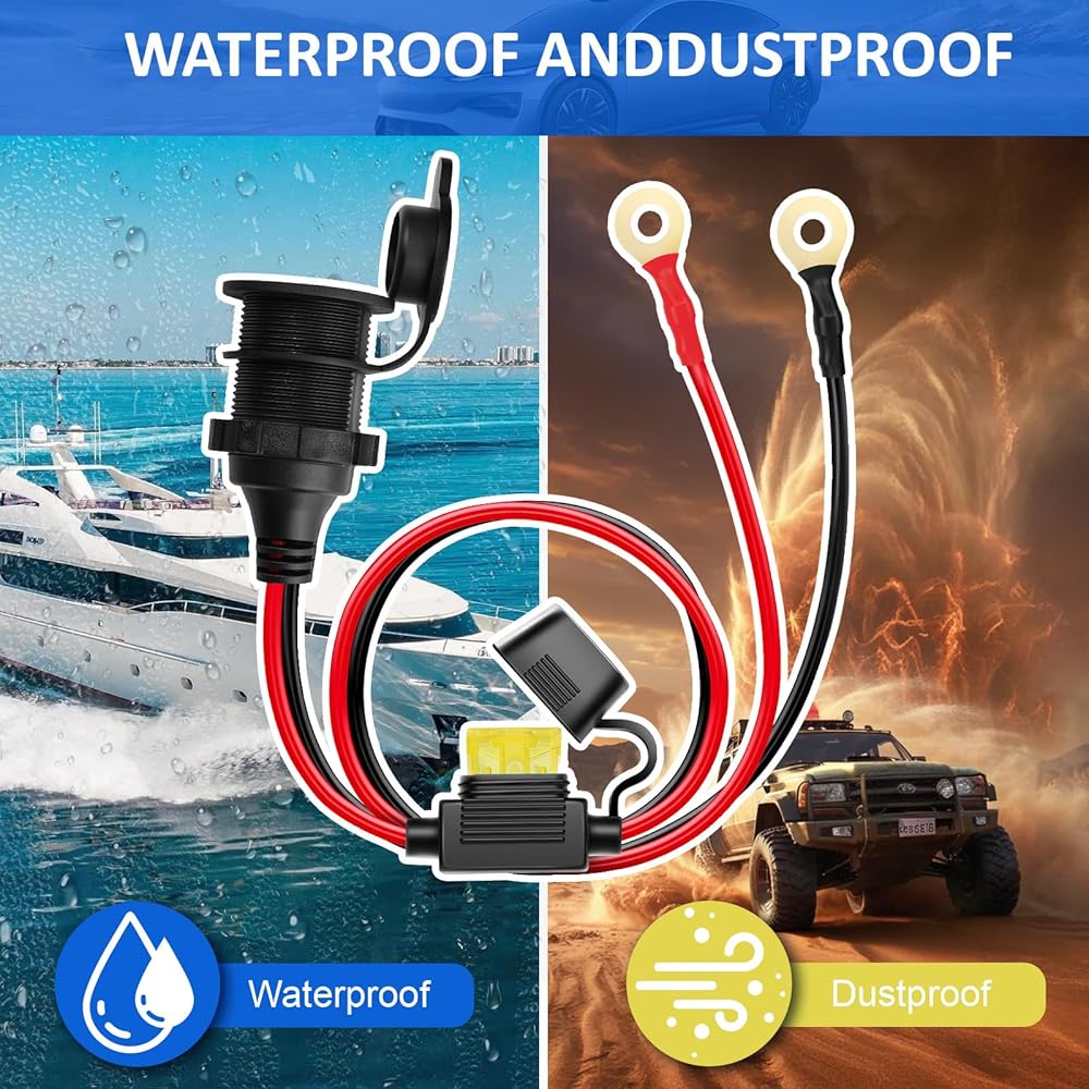 • With standard ring terminal connector(8.3mm), appropriate for you wiring directly to 12v deep cycle batteries ,used for all devices with cigarette lighter plug power supply.