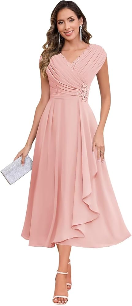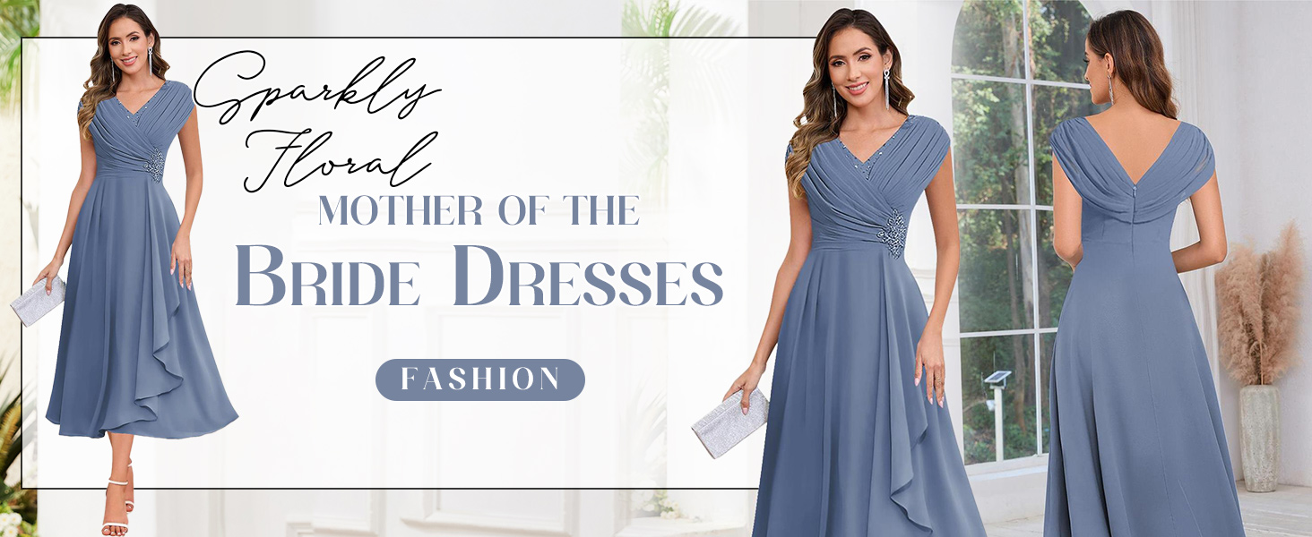 Feature: Sparkly floral mother of the bride dresses, elegant outdoor wedding party gowns, modern wedding guest dress, v neck, a line, cap sleeve, open back, high waist, tea length, chiffon, ruffles, sequin, pleated, ruched, zipper, it's a good choice to choose it as formal wedding gowns for women.
