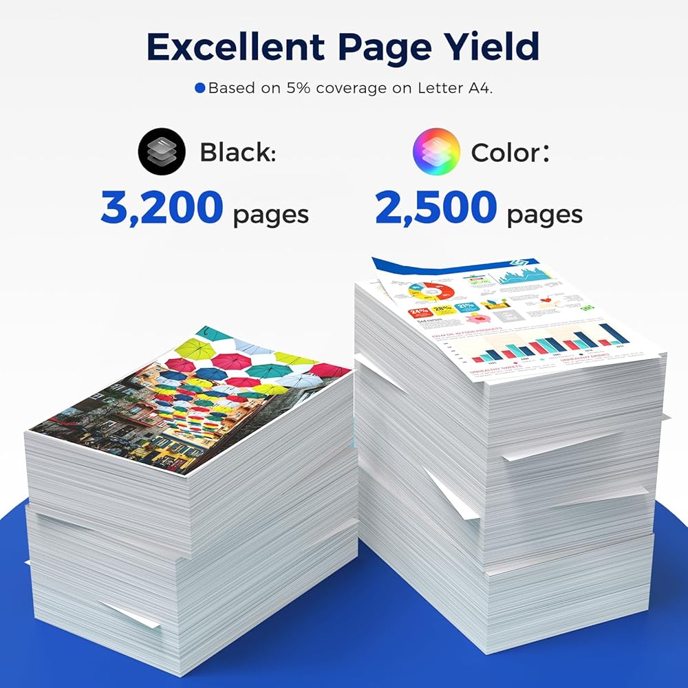 4 عبوات عالية الإنتاجية وفعالة من حيث التكلفة: توفر ما يصل إلى 3200 صفحة من الخرطوشة السوداء و2500 صفحة من كل لون (سماوي، أصفر، أرجواني) بتغطية قياسية بنسبة 5% للصفحة. يقلل التكلفة لكل صفحة، مما يجعله خيارًا اقتصاديًا للطباعة المنزلية الثقيلة ومهام الدراسة طويلة المدى.