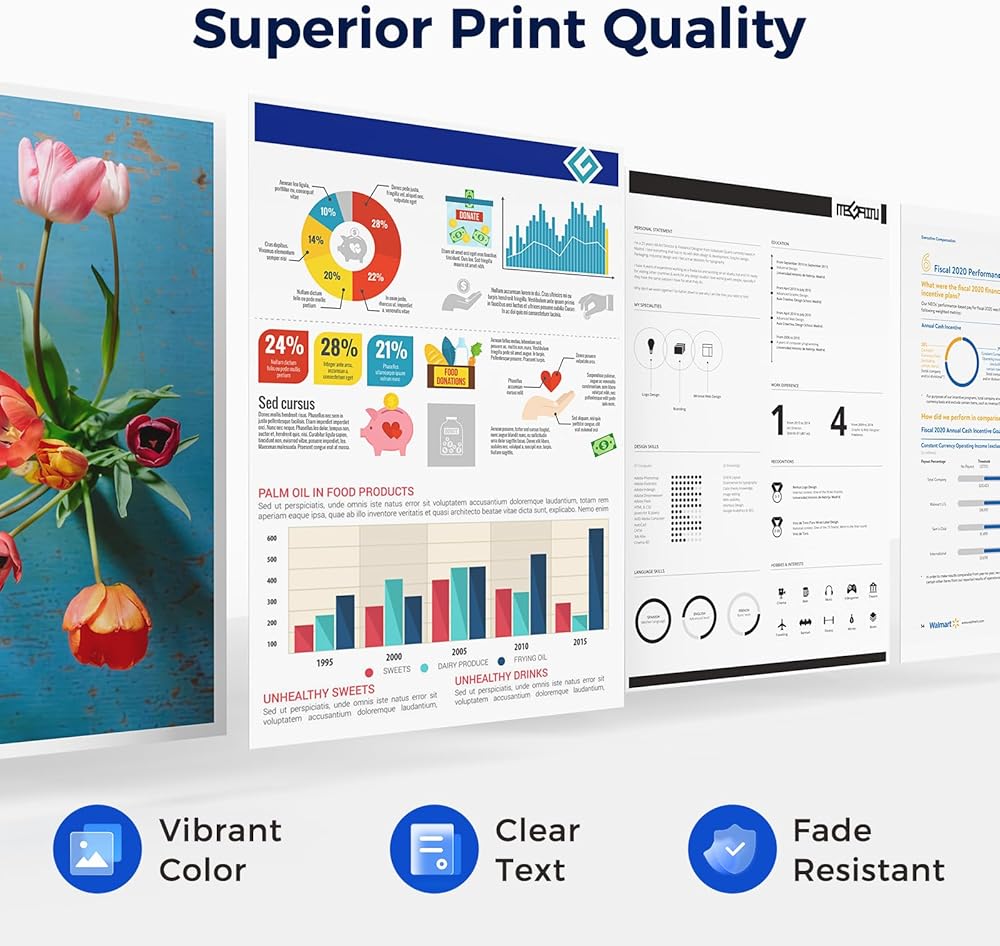 إخراج حاد وحيوي بجودة احترافية: ينتج الحبر عالي الجودة نصًا واضحًا وألوانًا نابضة بالحياة. لا يقتصر التميز على المستندات المكتبية الروتينية وتقارير الطلاب فحسب، بل يلبي أيضًا متطلبات الطباعة الملونة الاحترافية للعروض التقديمية والمواد التسويقية.