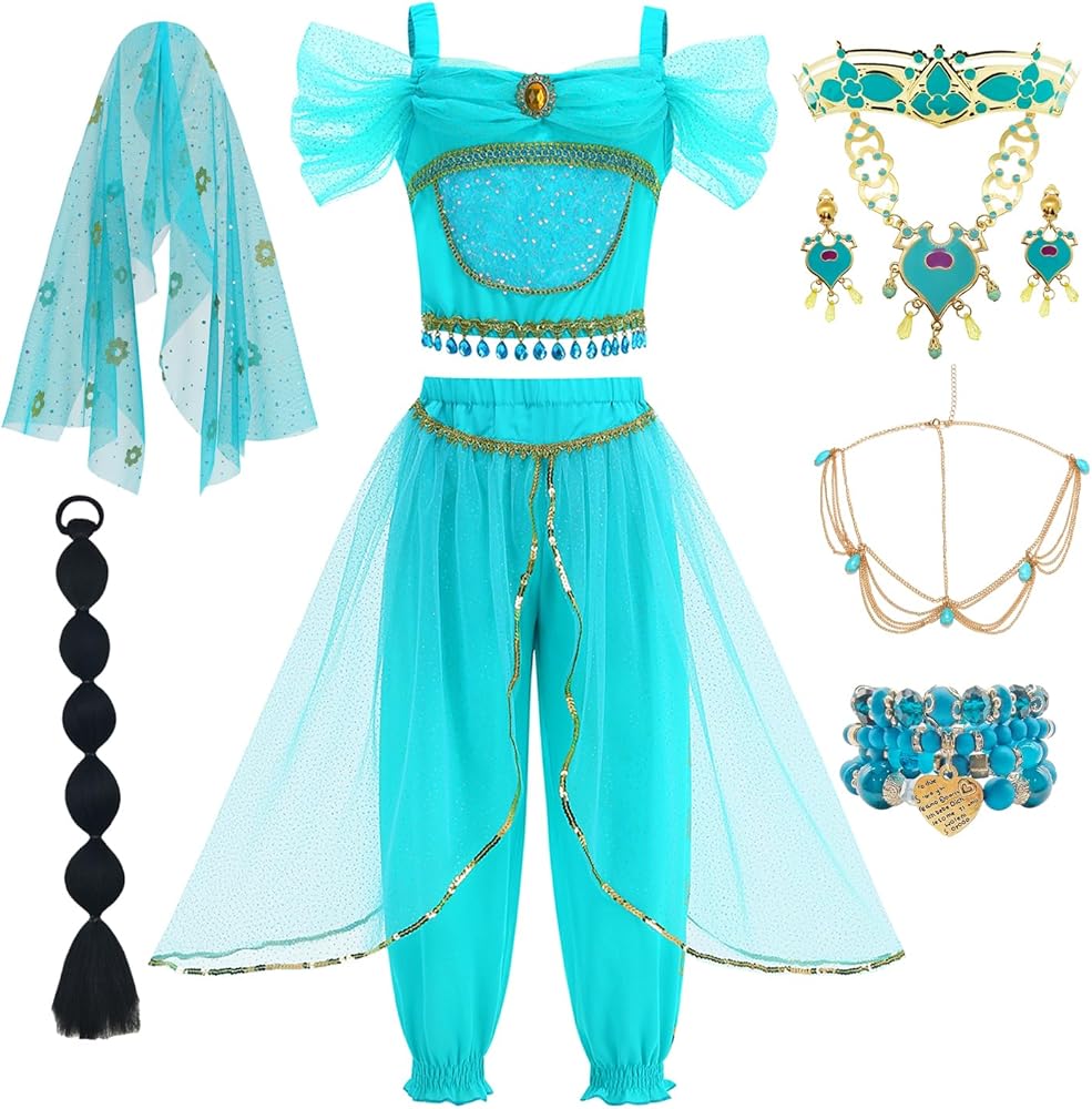 DESIGN FEATURES: Two-piece princess costume featuring a cropped top with puffy tulle sleeves and harem-style pants in stunning blue
