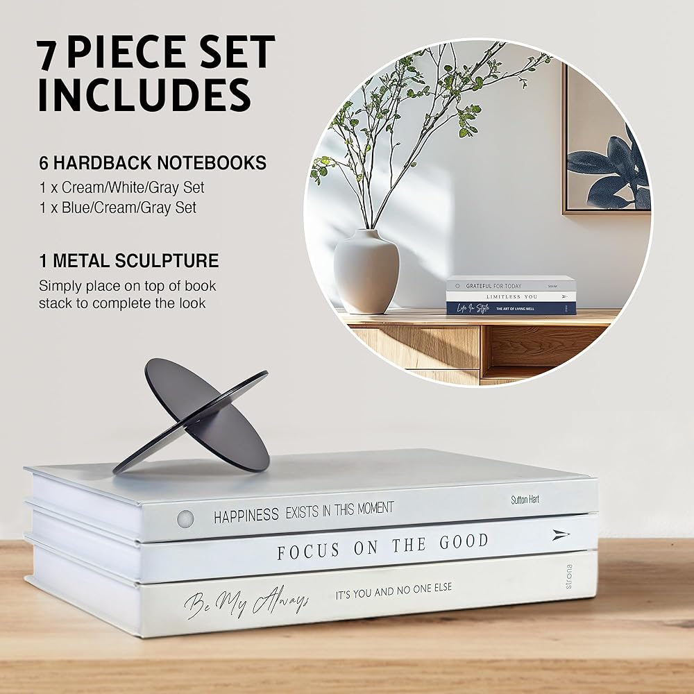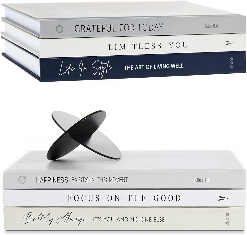 Book Decor Set Bundle of 6 Decorative Books for Home Decor with Black Metal Sculpture