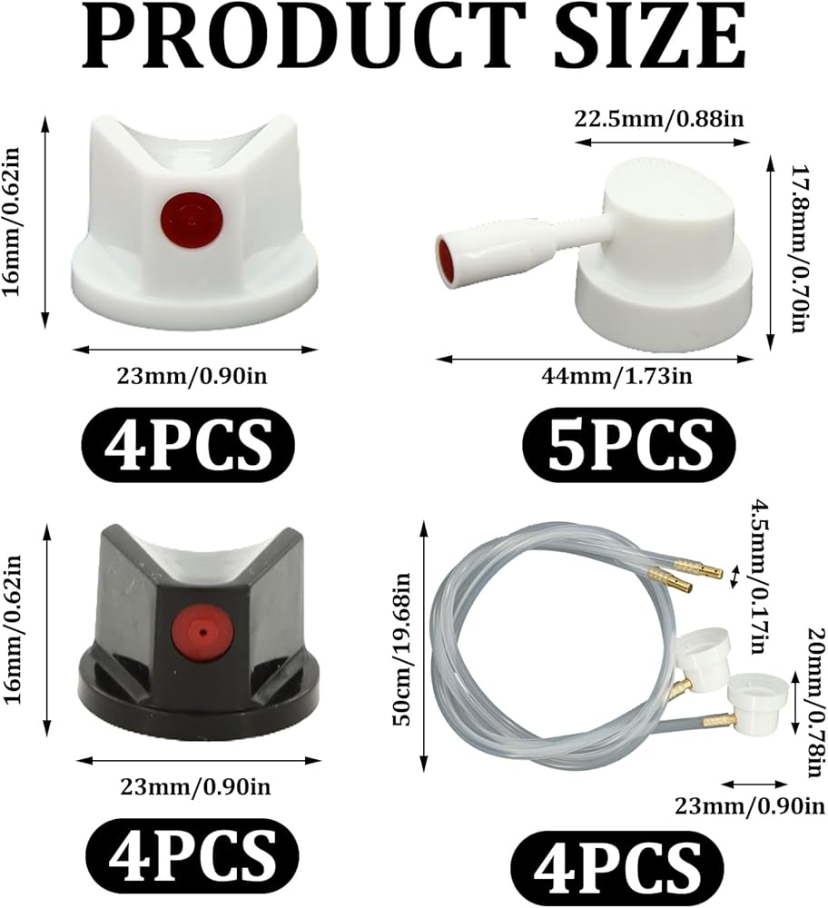 [Set Content] The set includes 5 extension hoses spray can nozzle, 4 black spray paint nozzles for cans, 4 white spray paint can nozzle, and 4 white long nozzles spray paint caps. Each component has been carefully designed to ensure that you can find the right accessories in different scenarios to meet your diverse needs.