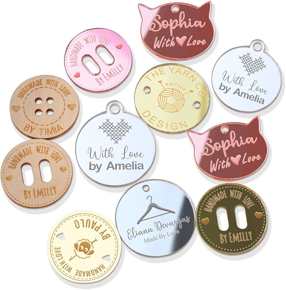 Why Choose Our Custom Labels? Most competitors offer only leather or fabric tags which can lose their shape or look dull over time. Our Mirror Acrylic tags provide a stunning reflective finish that catches the light, making your brand stand out. Our Wood tags offer a timeless, organic feel perfect for farmhouse-style or rustic crochet projects.