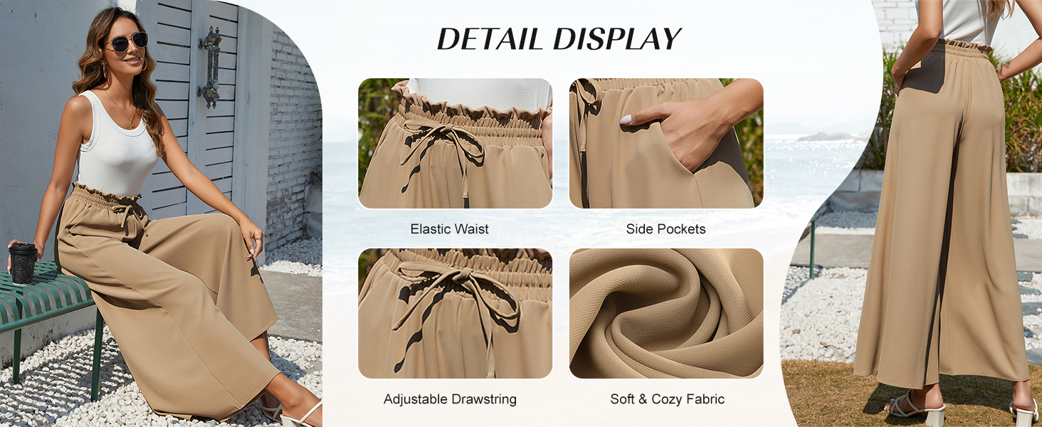 • - خصر مرن عالي مريح مع رباط: مصمم بحزام خصر مرن عالي الخصر ورباط قابل للتعديل، هذه السراويل النسائية تتكيف بسهولة مع أشكال الجسم المختلفة. يوفر الخصر المرن دعمًا لطيفًا دون الحاجة إلى الحفر، مما يجعله مثاليًا لساعات طويلة من الارتداء في العمل أو في العطلات.
