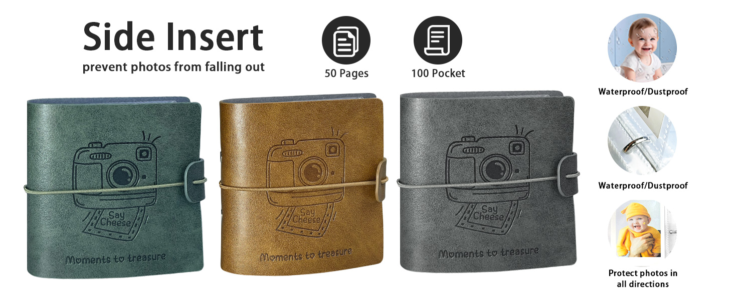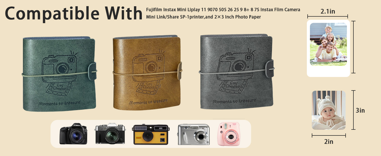 حجم صغير محمول: يمكنك بسهولة حمل ألبوم الصور الصغير الخاص بك في حقيبة الظهر أو حقيبة اليد أو حتى الجيب الكبير. تم تصميم ألبوم صور المحفظة هذا لسهولة الوصول إليه أثناء التنقل، بحيث تكون لحظاتك المفضلة دائمًا في متناول يدك - أينما تأخذك الحياة