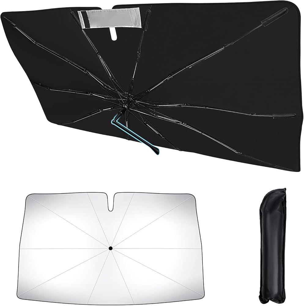 【قابلة للطي والحمل] تتميز بتصميم مظلة شمسية قابلة للطي يمكن طيها إلى حجم صغير (16*2.7*2.7 بوصة). يمكن تخزينه بسهولة في صندوق القفازات الخاص بك أو تحت المقعد - وهو مثالي للحماية من أشعة الشمس أثناء التنقل.