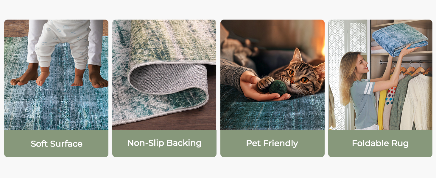 • يمكن غسلها في الغسالة: استمتع بالراحة مع السجادة ذات اللون الأزرق المخضر القابلة للغسل. للتنظيف اليومي، استخدم المكنسة الكهربائية أو اغسل السجادة في الغسالة. نظرًا لتصميمها منخفض الوبر، فهي مقاومة للبقع، ويمكن تنظيفها بسهولة مباشرة باستخدام الإسفنجة