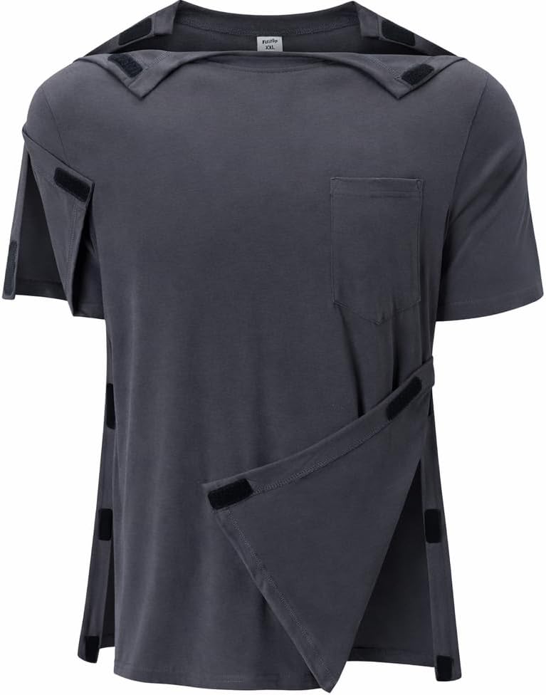 • يبدو مثل التيشيرت العادي: على عكس أنماط فساتين المستشفى، يحافظ هذا القميص القابل للتمزيق على صورة ظلية كلاسيكية قصيرة الأكمام مع تفاصيل جيب على الصدر، مما يوفر مظهرًا يوميًا أثناء مراحل التعافي.