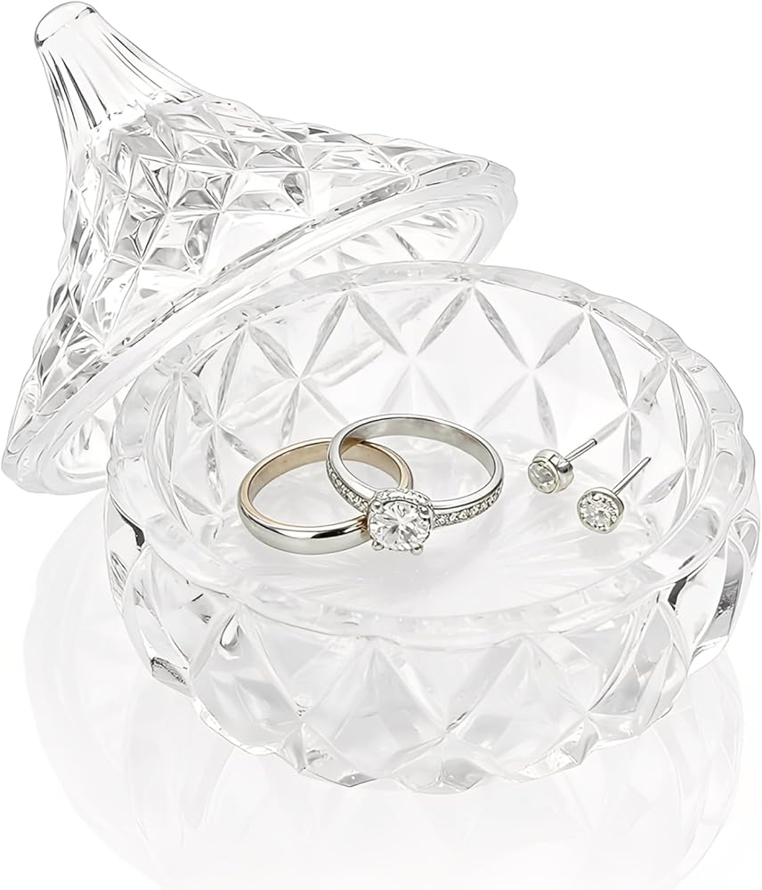 Crystal-Clear Glass Construction: This jewelry dish is expertly crafted from premium transparent glass, offering a luxurious crystal ring holder aesthetic while serving as a functional small jewelry box and candy dish with lid—ideal for displaying rings, earrings, or candies