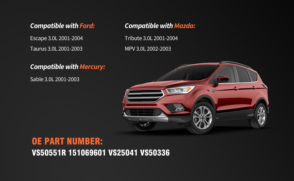 [قابلية التطبيق] الجزء متوافق مع Ford Escape 3.0L 2001-2004 Taurus 3.0L 2001-2003. متوافق مع Mazda Tribute 3.0L 2001-2004 MPV 3.0L 2002-2003. متوافق مع Mercury Sable 3.0L 2001-2003. يرجى التحقق بعناية من سيارتك السنة/الطراز/الطراز باستخدام مكتشف الأجزاء/التوافق