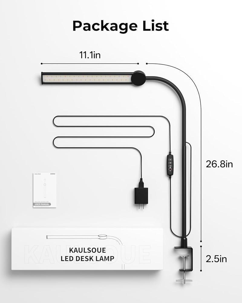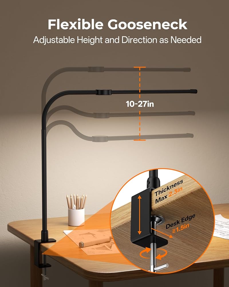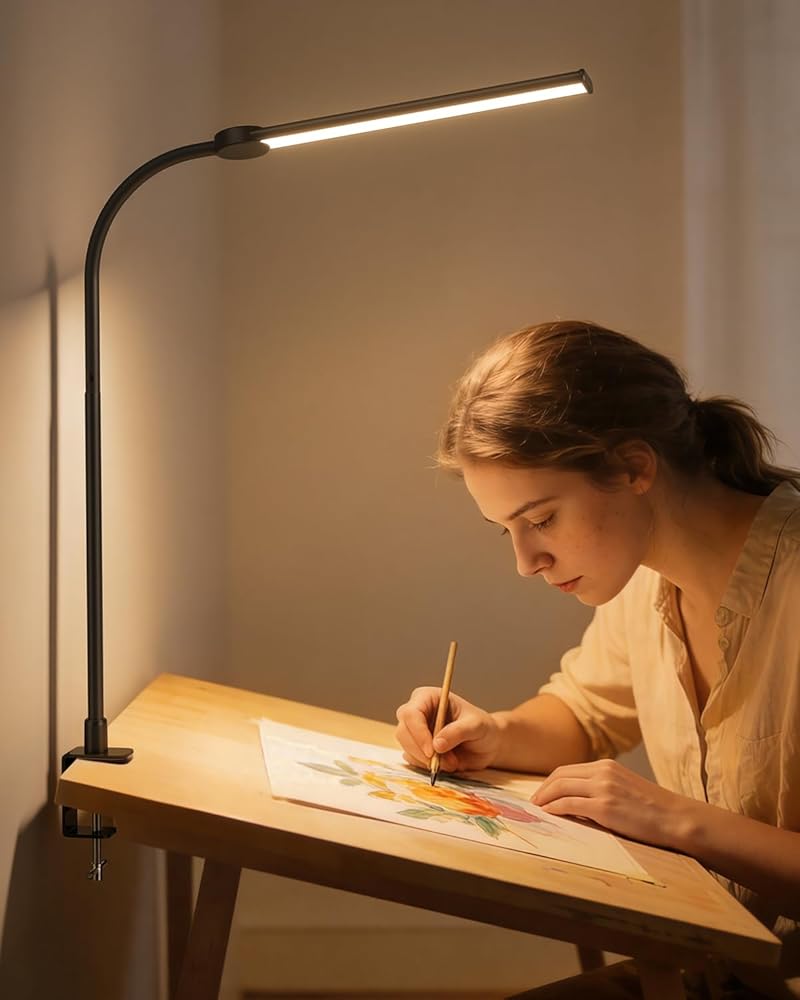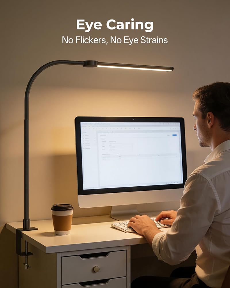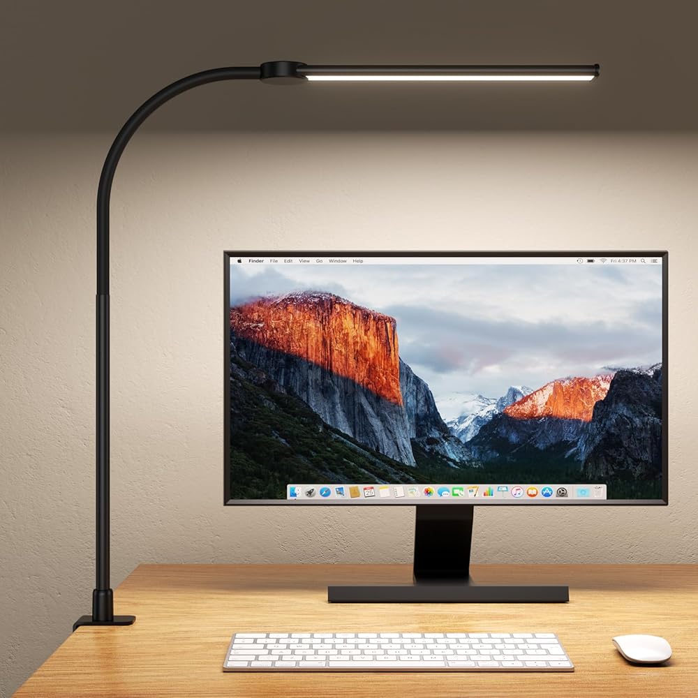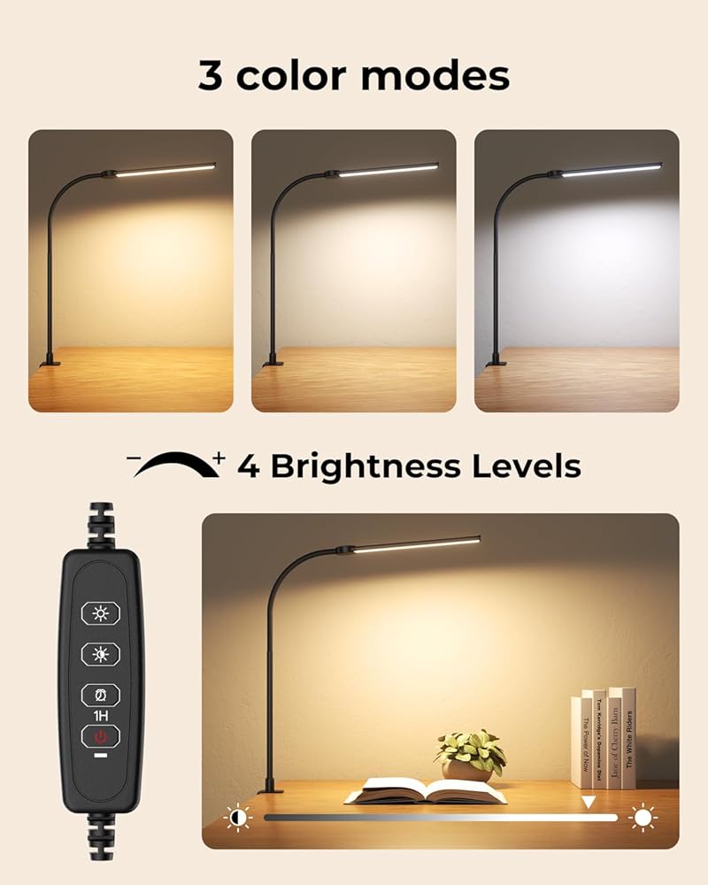 أوضاع إضاءة متعددة الاستخدامات: يوفر مصباح المكتب المزود بمشبك 3 أوضاع ألوان (3000 كلفن دافئ، 4500 كلفن ضوء أبيض دافئ، و6500 كلفن ضوء بارد) و4 مستويات سطوع. يتيح لك هذا تخصيص الضوء بالكامل ليناسب أي مهمة أو حالة مزاجية، مما يعزز الراحة البصرية ومساحة العمل المثالية