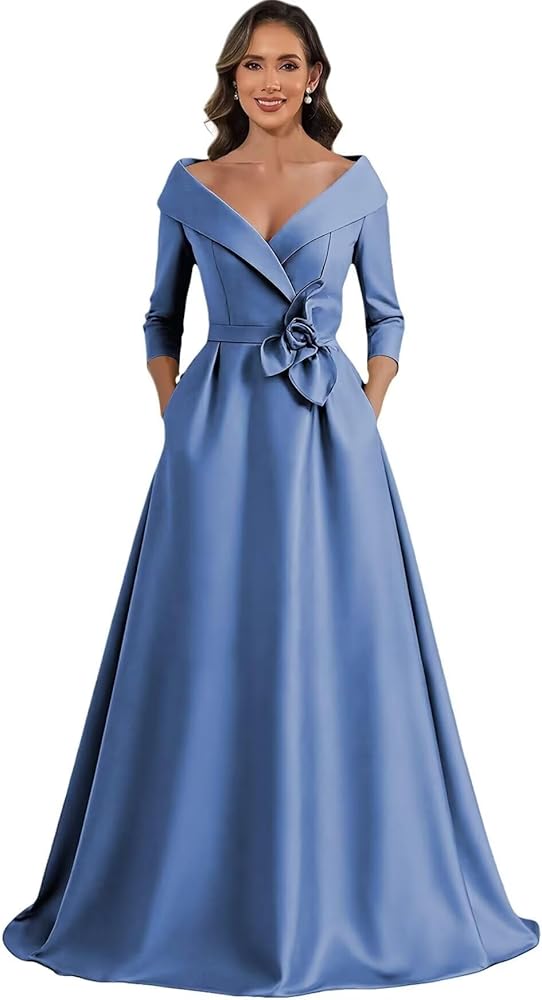 فساتين أم العروس من الساتان للنساء بدون أكتاف وأكمام طويلة فستان رسمي لحفلات الزفاف مع جيوب in Kuwait