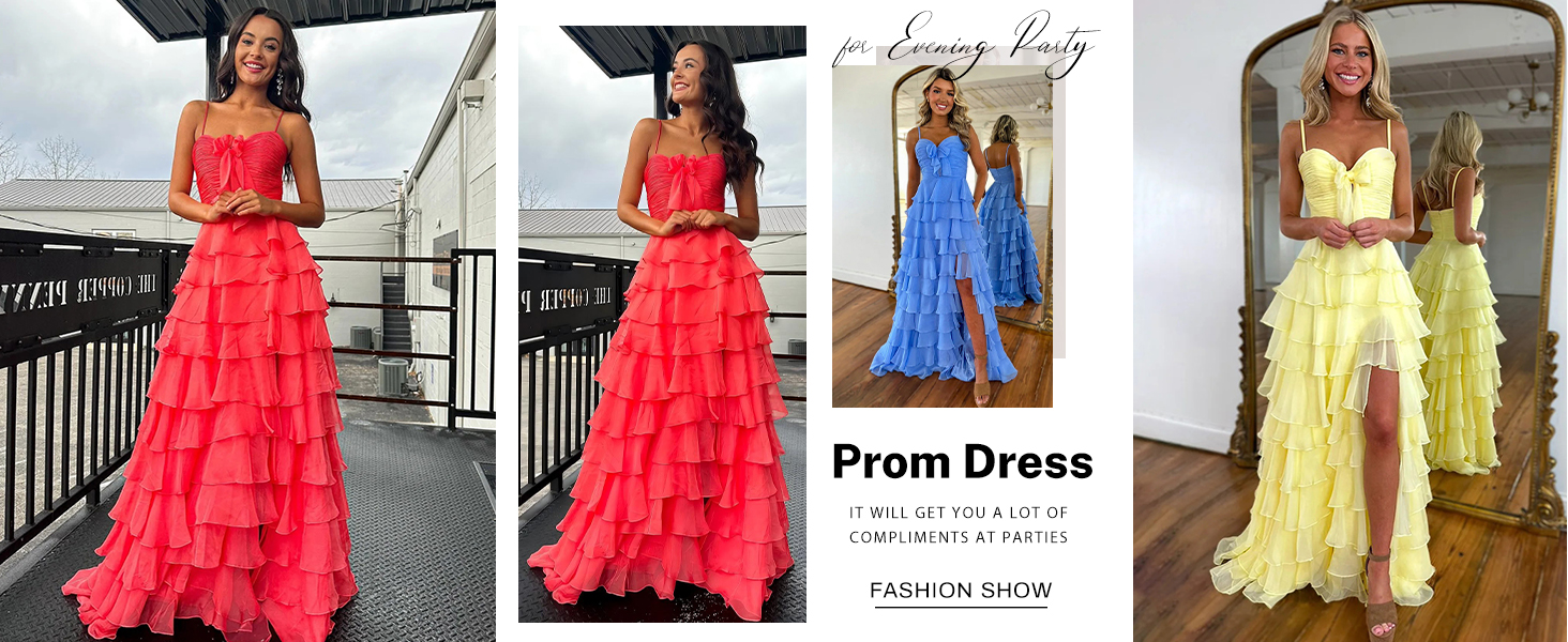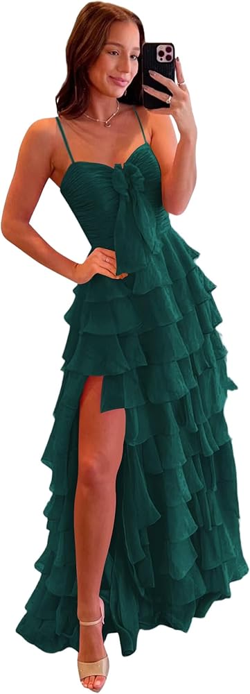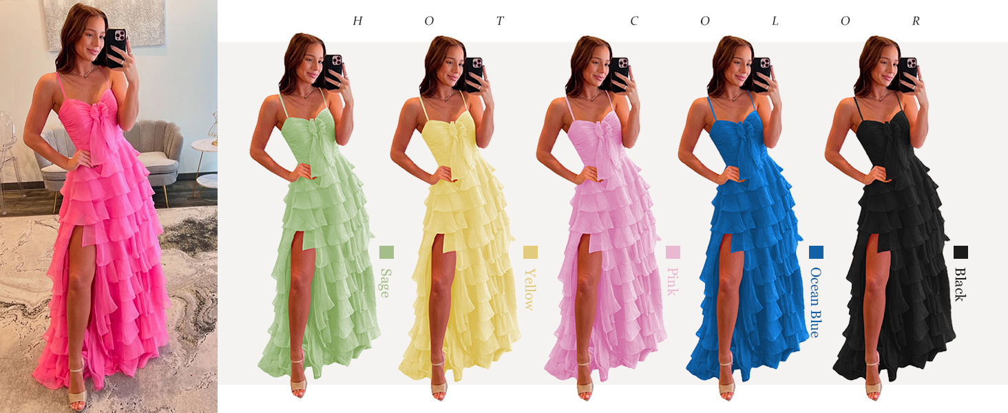 الميزات: يتميز فستان الحفلة الراقصة المصنوع من الشيفون ذو الشريط السباغيتي بصدرية ملتوية مع تفاصيل فيونكة، وخصر مكشكش، وتنورة مكشكشة ذات طبقات، وفتحة عالية، مما يخلق صورة ظلية مثيرة ومتدفقة مثالية للحفلات الراقصة والمناسبات الرسمية.
