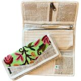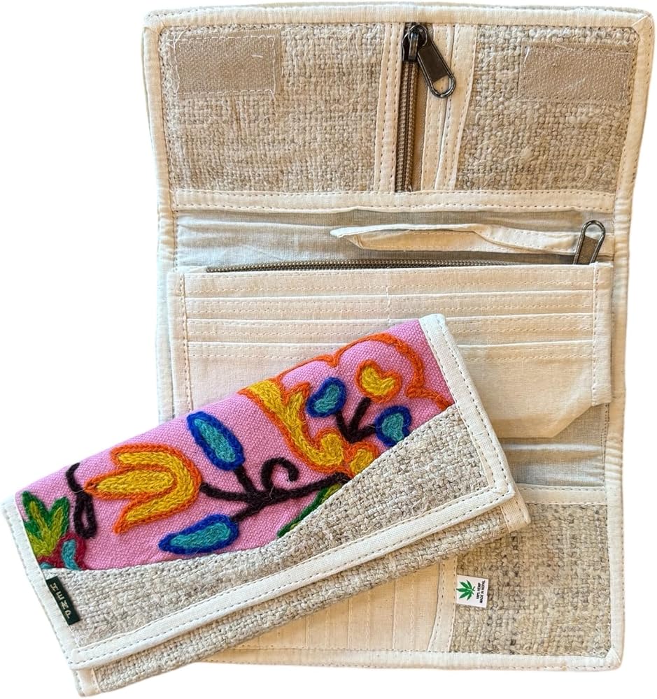 Our women's tri-fold hemp wallet is handmade in Nepal. It has beautiful colorful embroidery on the front while the remaining wallet is made from 100% hemp as well as organic cotton lining. This wallet is 9" by 4" when closed by velcro closure. It has so many compartments and slots for driver's license, credit or debit cards, space for coins, and cash. This can be used as a wallet or clutch purse.