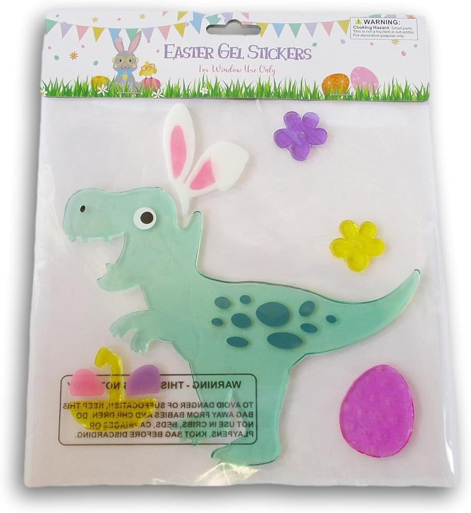 Create a festive window display with these Easter Gel Window Clings! These sticky gel pieces feature a t-rex with bunny ears, with egg and flower accents. Plus, you can wash them and reuse them year after year. Stick them on windows to celebrate the Easter season!