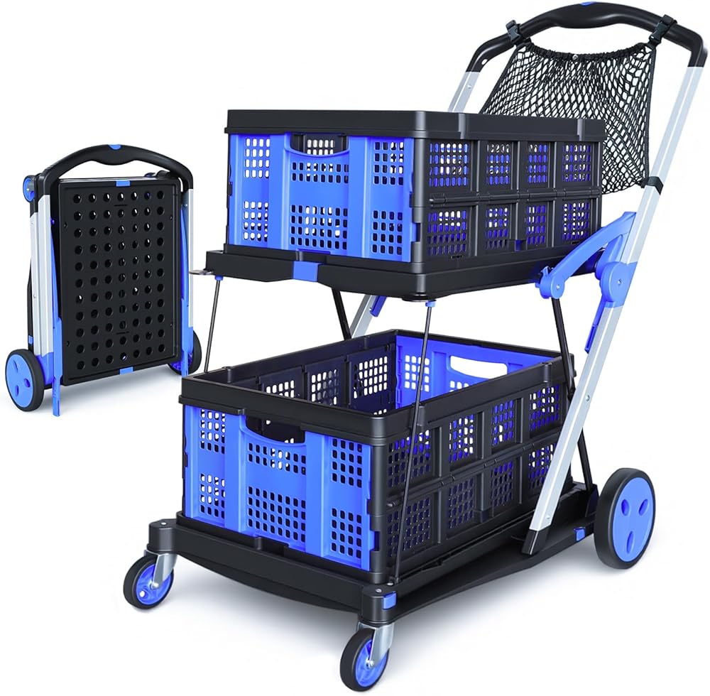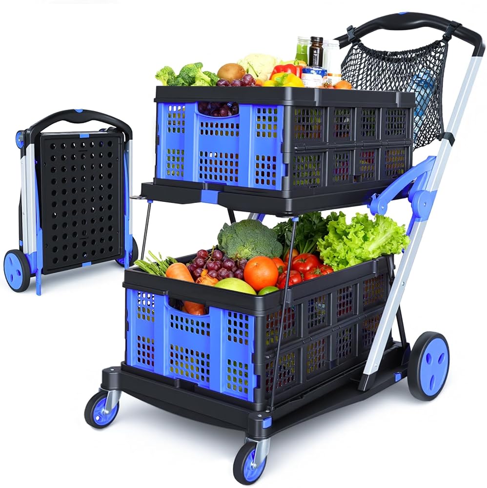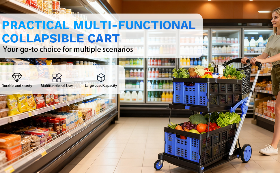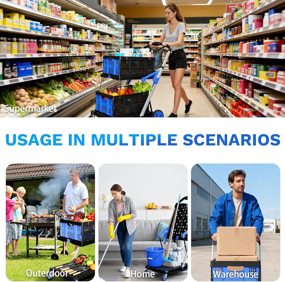 صناديق تخزين PP عالية الجودة: تأتي عربة التسوق هذه مع 2 صناديق تخزين مدمجة قابلة للطي وحقيبة تخزين واحدة. عربة التسوق مصنوعة من مادة PP - متينة وخفيفة الوزن وسهلة التنظيف. لا حاجة لإعداد حاويات إضافية: يمكن للصناديق حمل البقالة أو مستلزمات النزهة أو المستندات المكتبية أو أدوات الحديقة مباشرة، ويمكن طيها بشكل مسطح مع عربة التسوق عندما لا تكون قيد الاستخدام، مما يجعل حمل الأشياء أكثر ملاءمة.